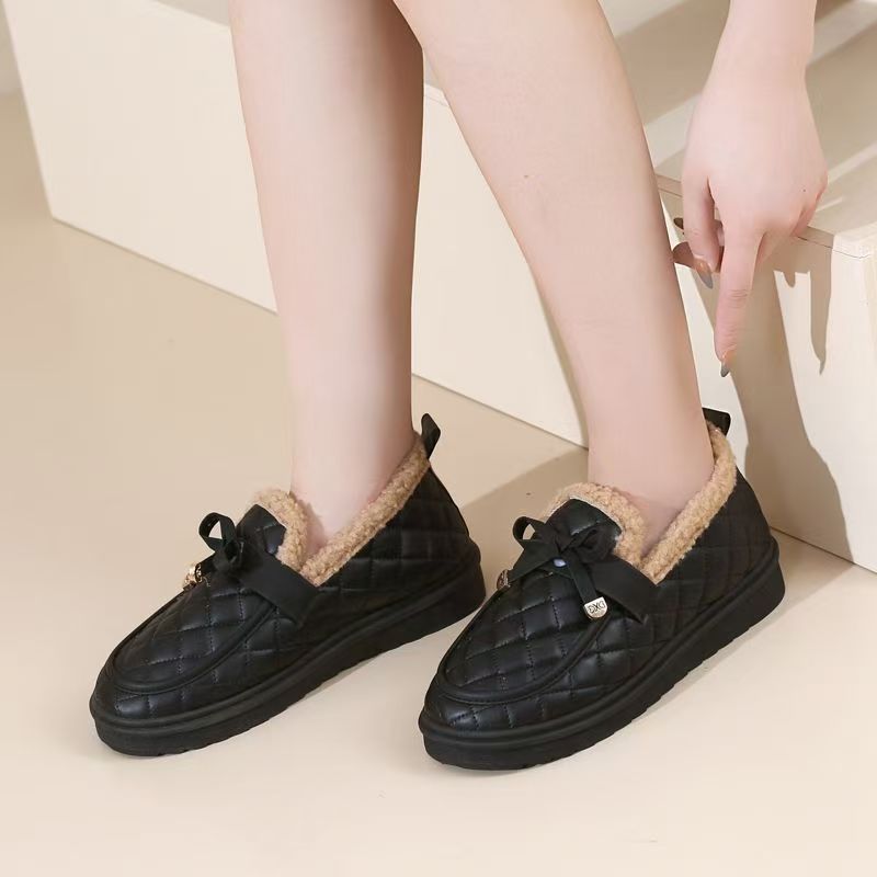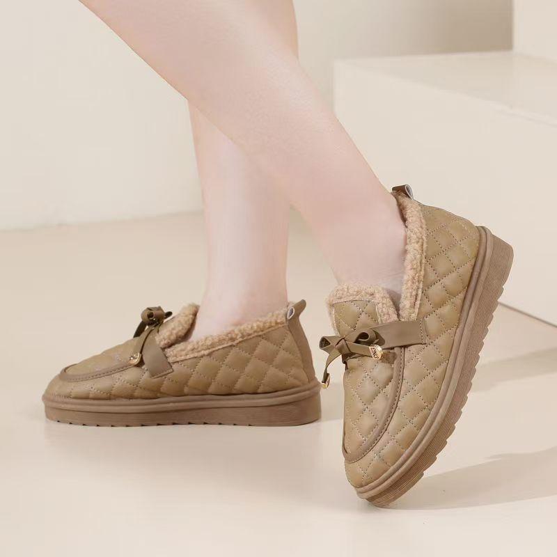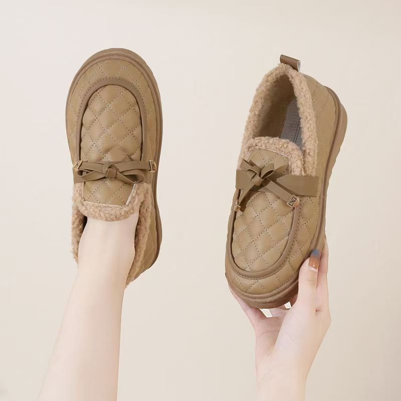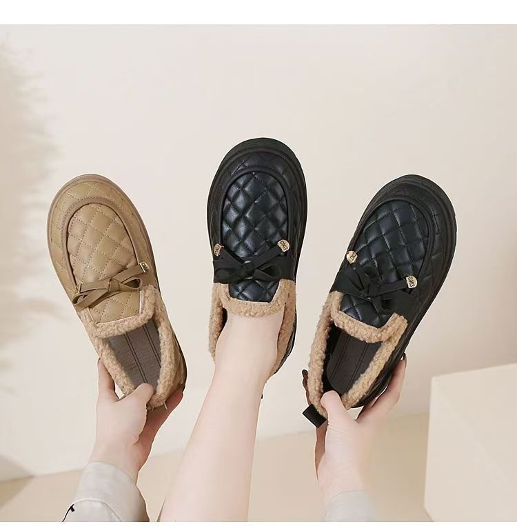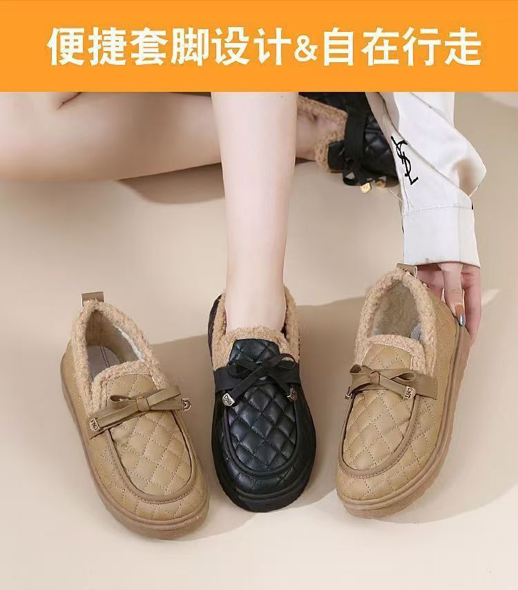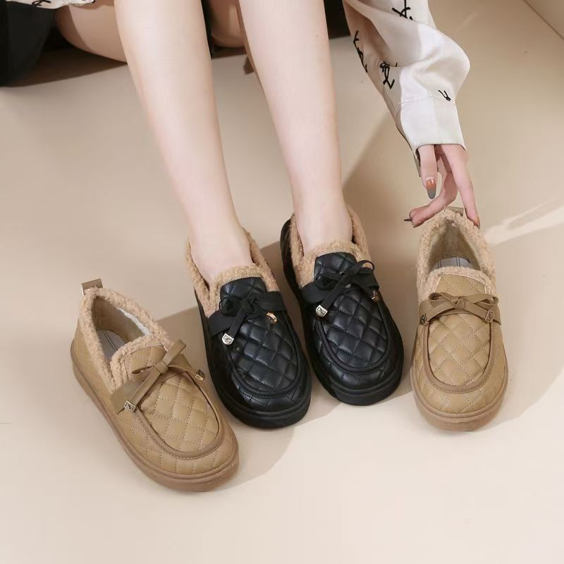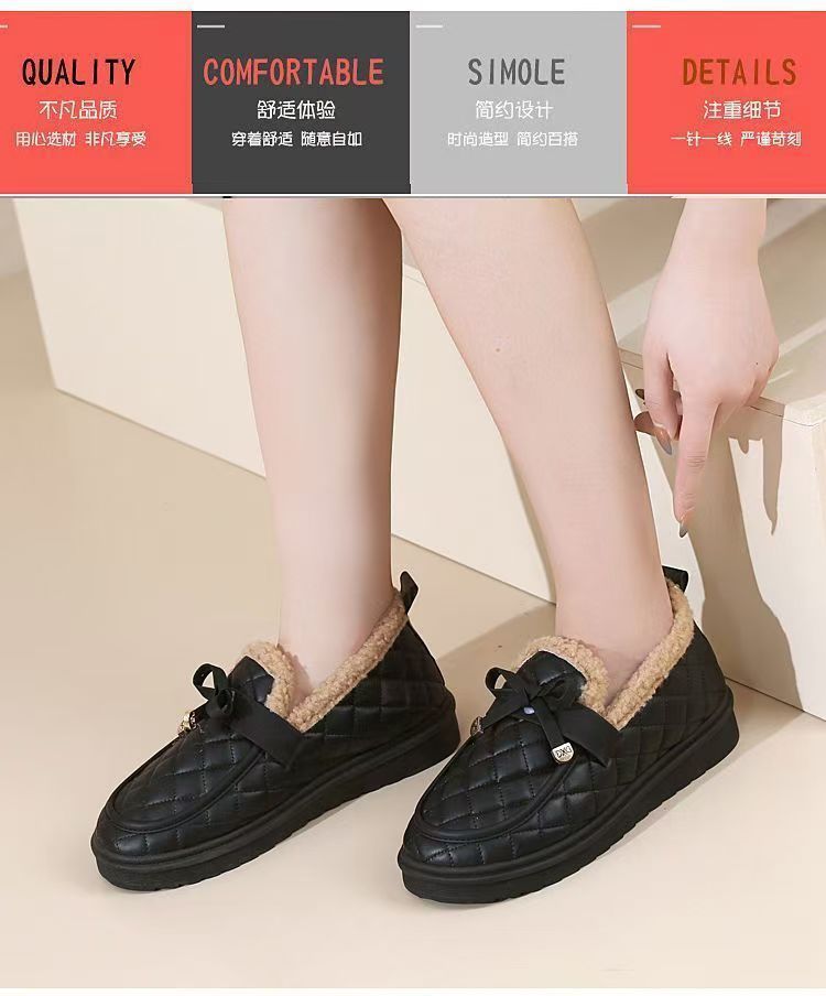 冬用レディース耐摩耗性厚手綿靴、柔らかい底と表面の豆豆シューズ、滑り止めフラットソール、カジュアルでおしゃれなファーシューズ