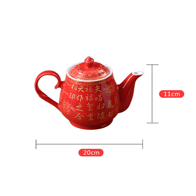結婚式の赤いティーポット、ウェディングティーセット、ハッピーな言葉のティーポット、ティーポット、中国風の結婚式の宴会用品、写真を参照してください。