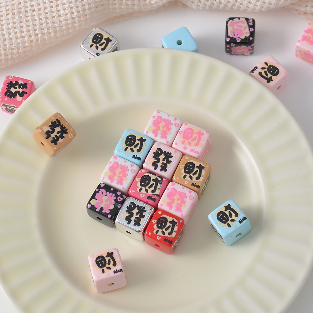 亚克力发财方块印花竖孔串珠 diy配件手机链车挂包链饰品材料散珠