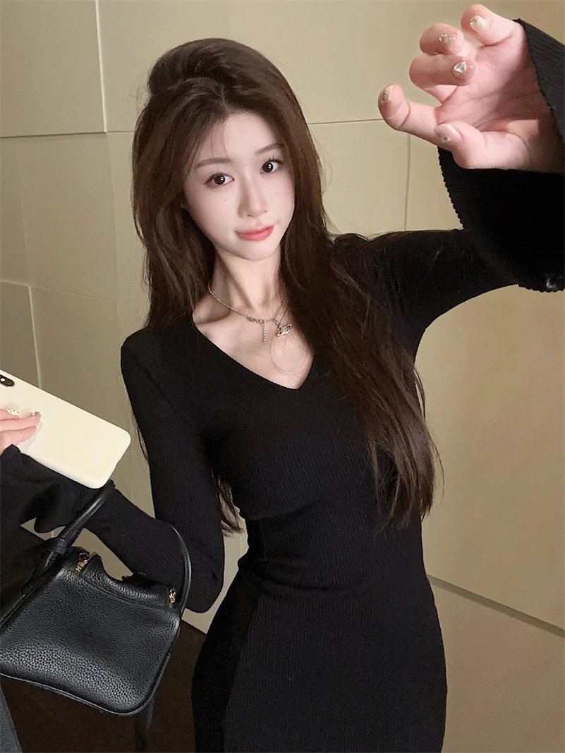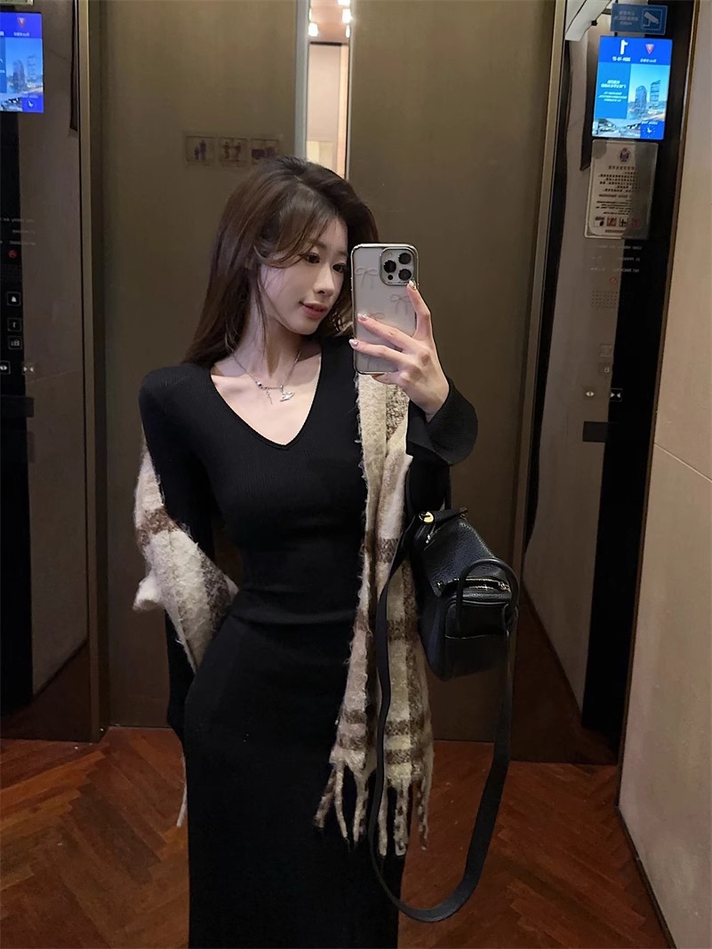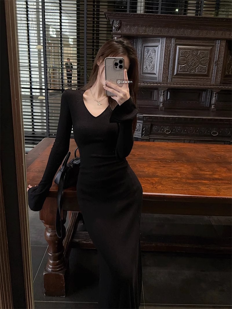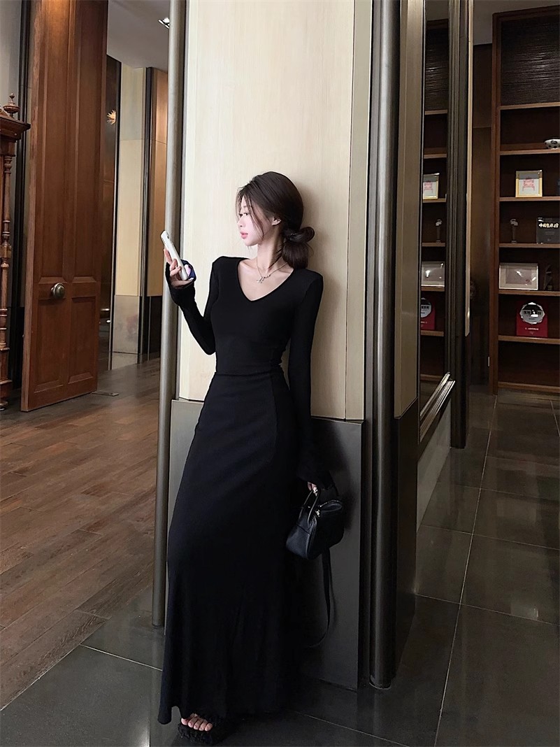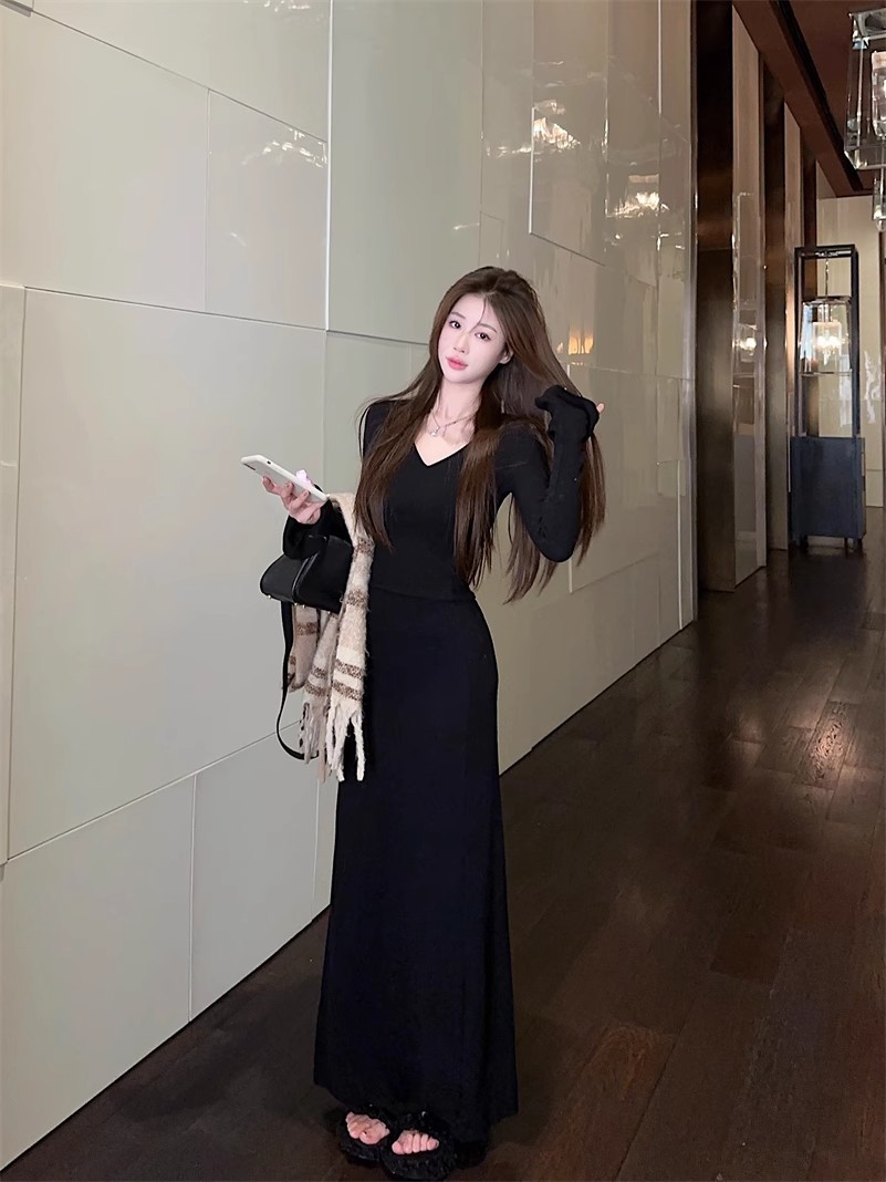 優しい風の気質vネックの中に長袖のニットのワンピースの女性の秋冬の黒色のギャルは腰を収めて長いスカートを修理します。