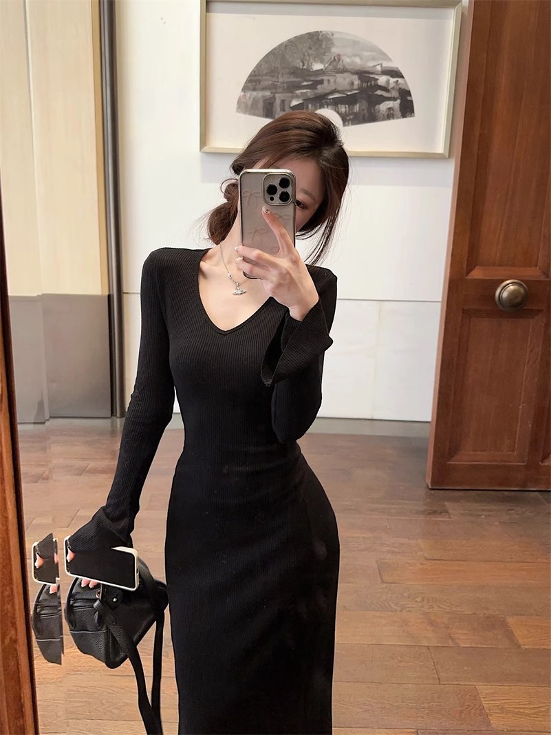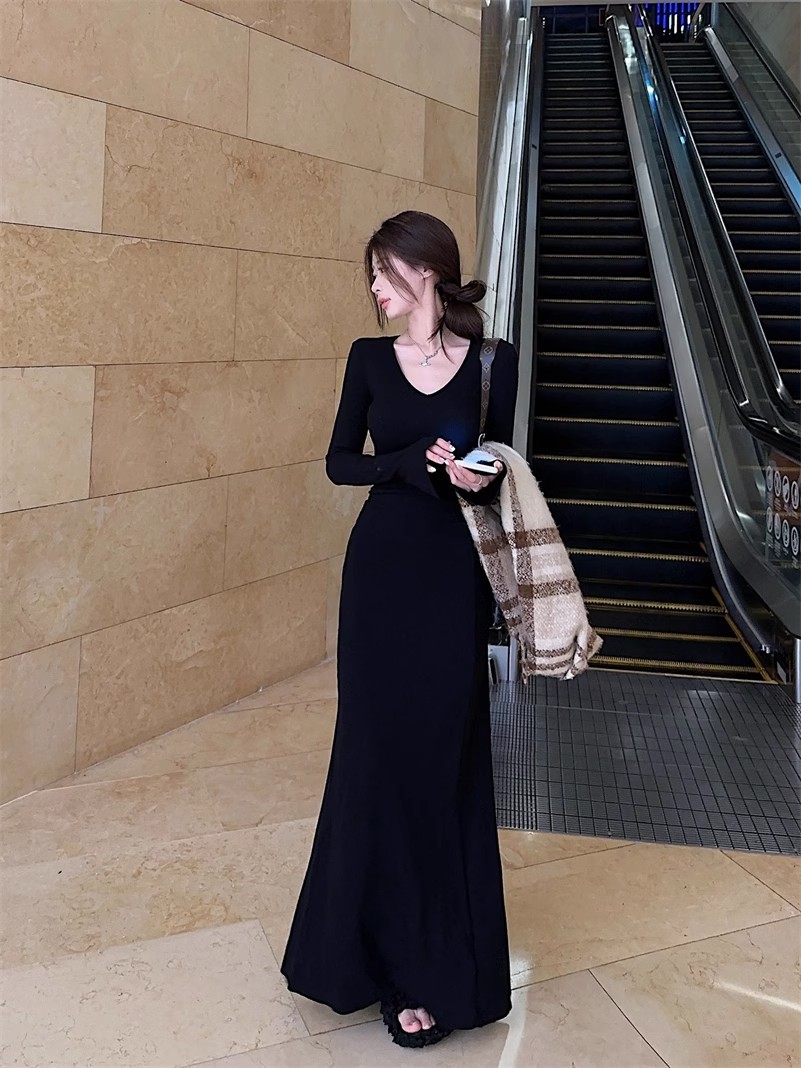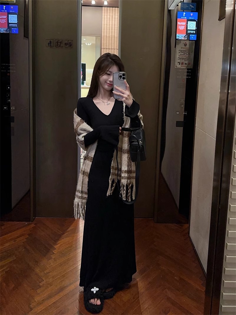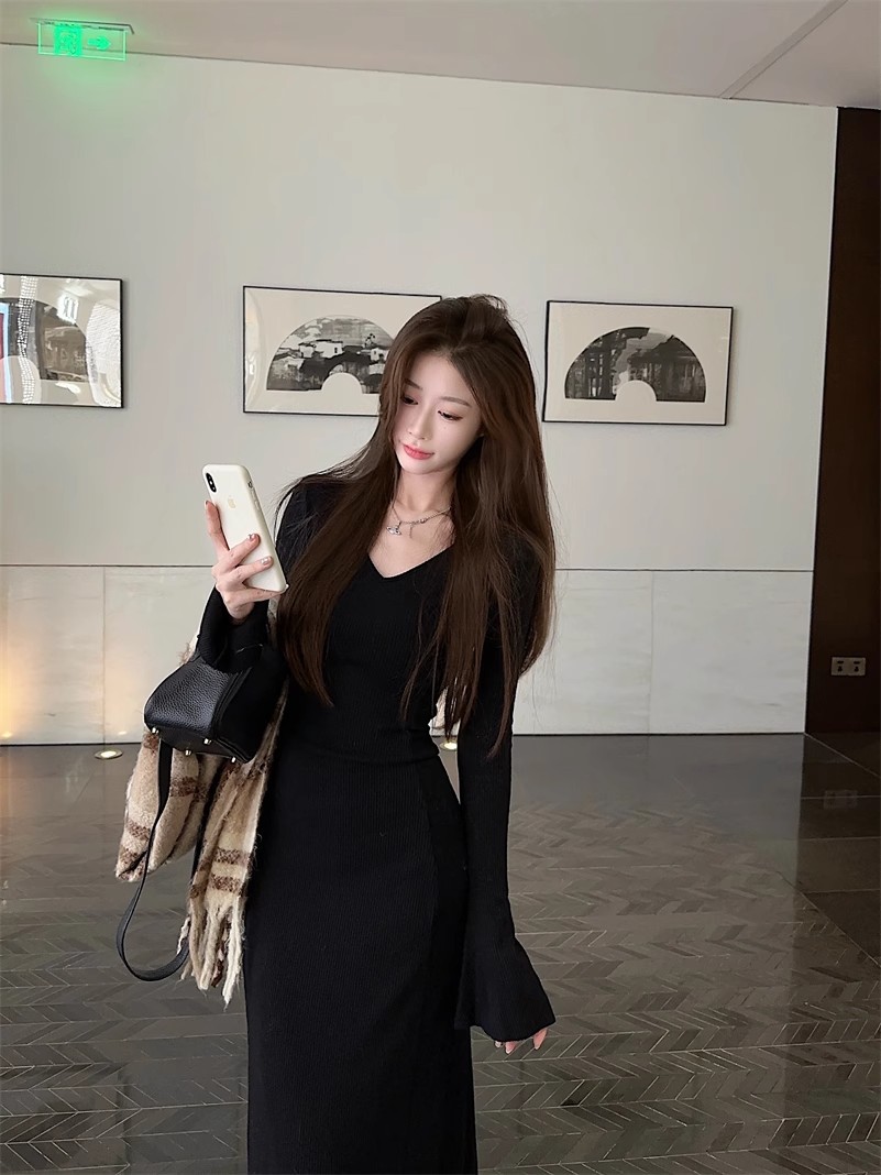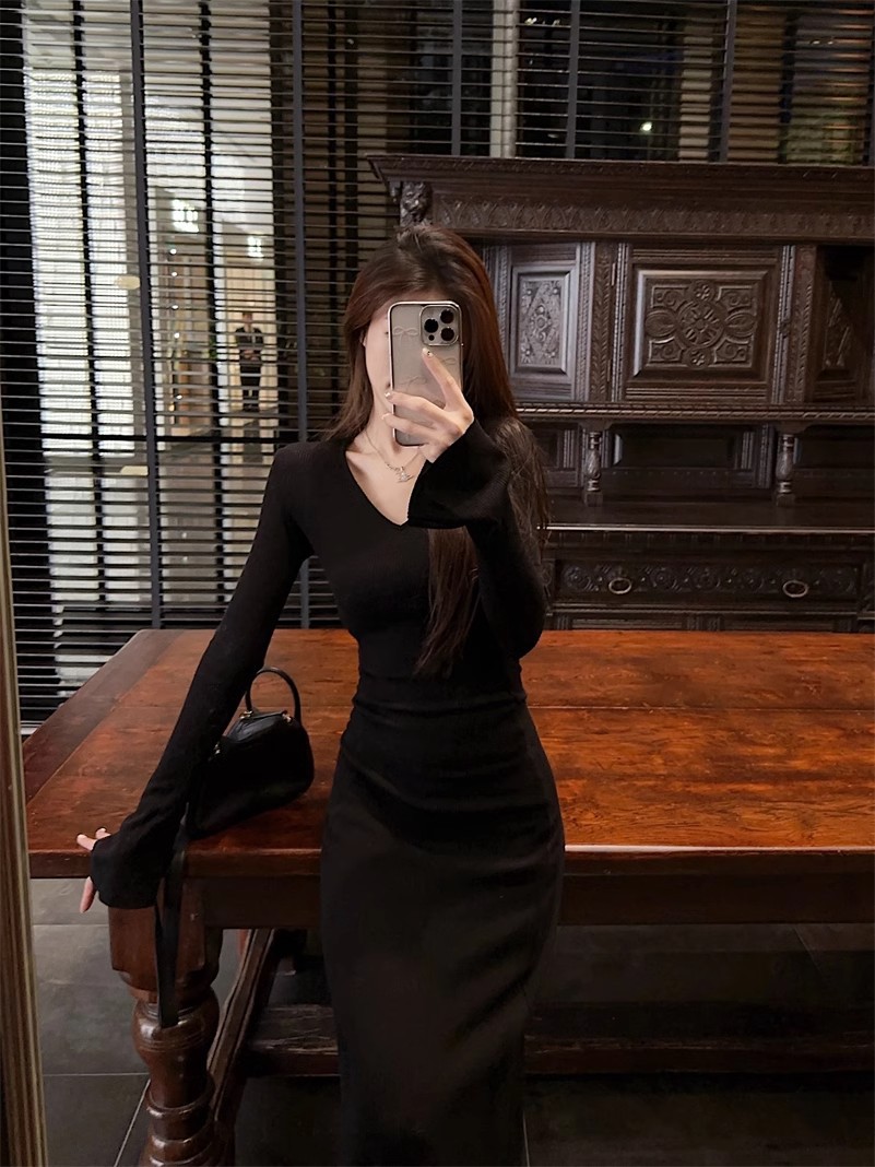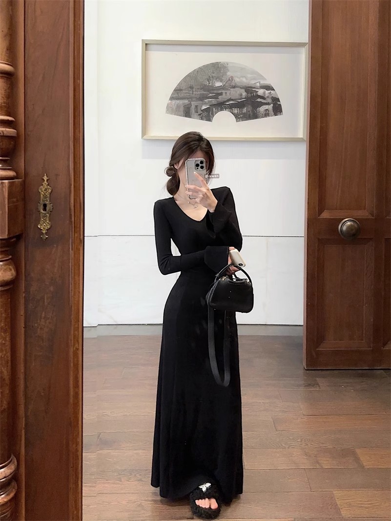 優しい風の気質vネックの中に長袖のニットのワンピースの女性の秋冬の黒色のギャルは腰を収めて長いスカートを修理します。