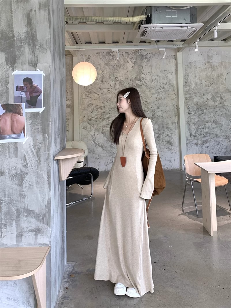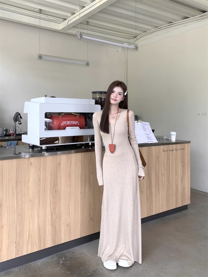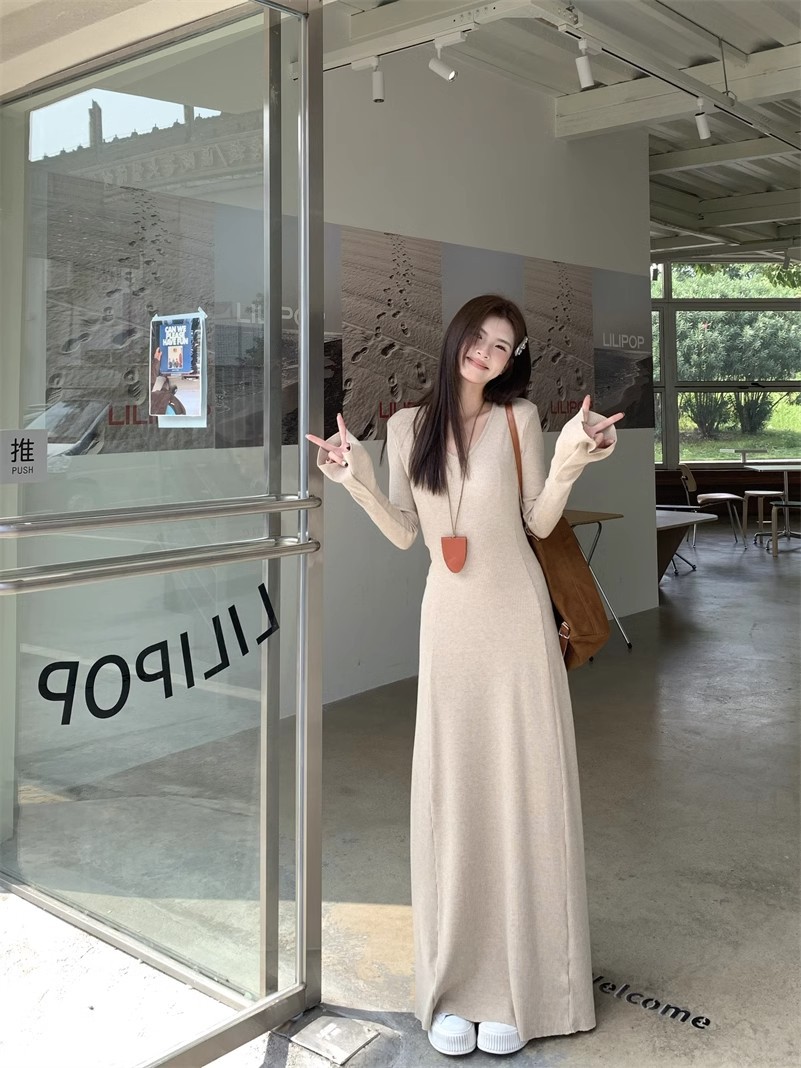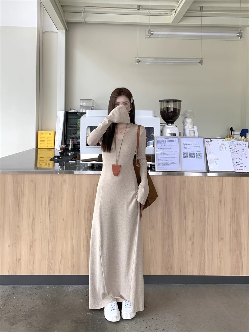 秋冬の新型の気質vネックのニットのワンピースの女性の秋冬のギャルのコートの中は底を打ってお尻のロングスカートを包みます。