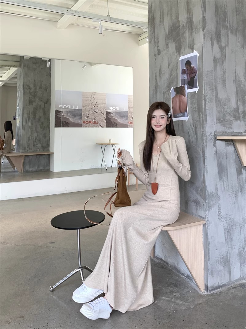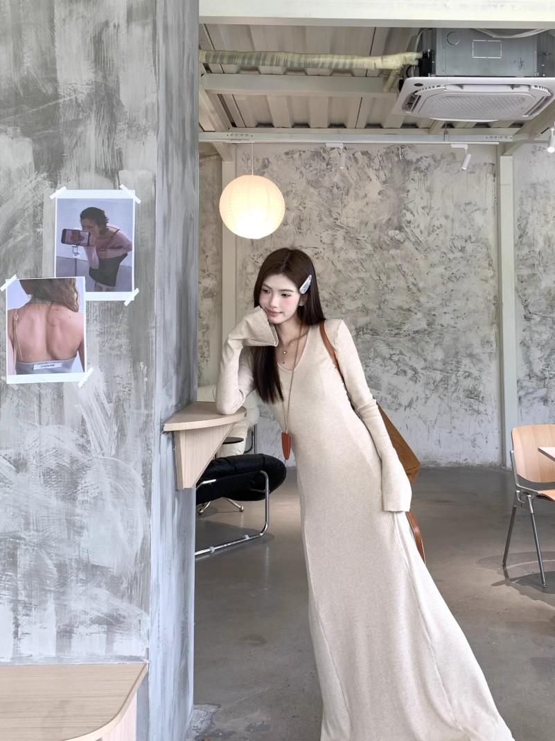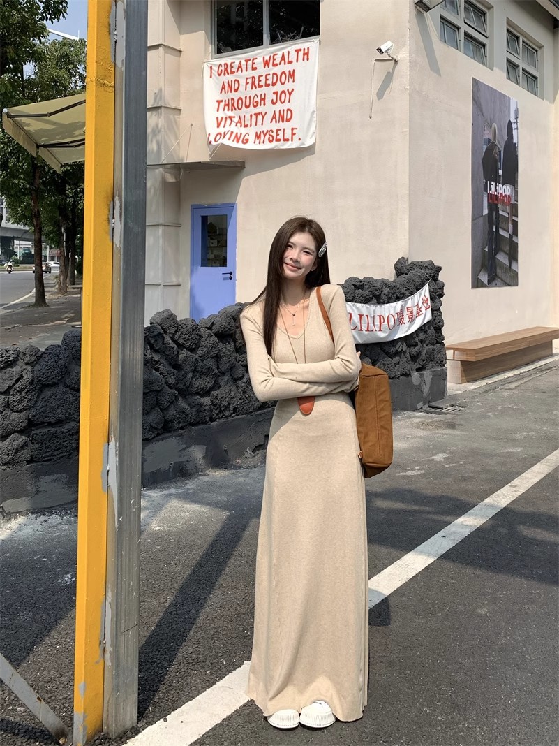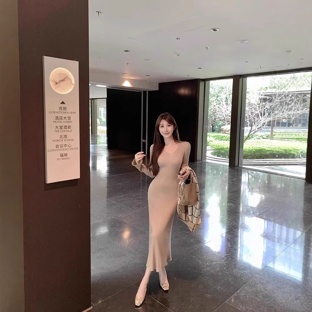 秋冬の新型の気質vネックのニットのワンピースの女性の秋冬のギャルのコートの中は底を打ってお尻のロングスカートを包みます。