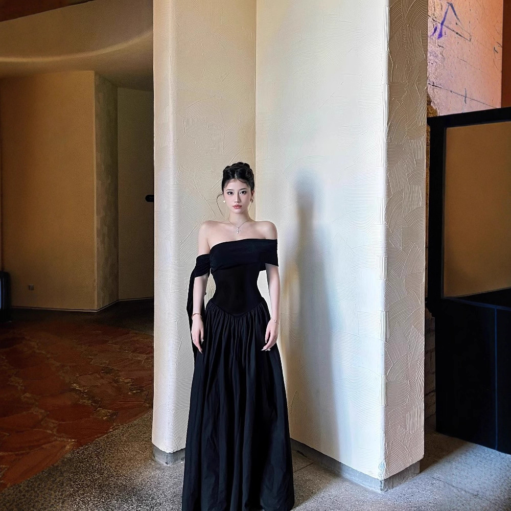 法式气质一字肩连衣裙女2025年夏季新款掐腰显瘦设计感黑色长裙子