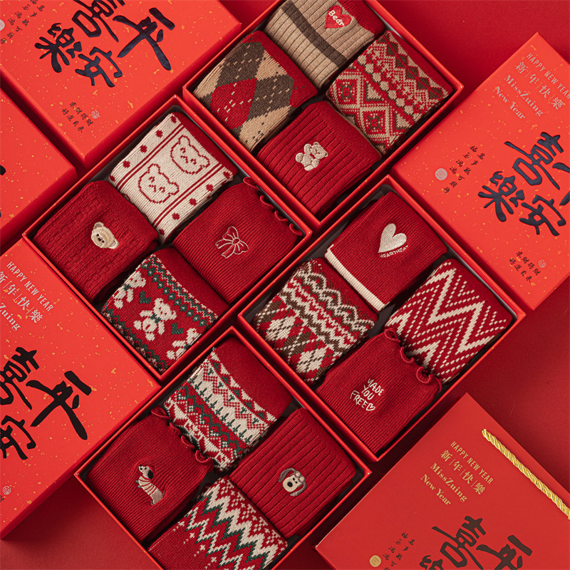 礼盒红袜子女秋冬羊绒袜加厚保暖双针无线头新年礼盒装红色中筒袜