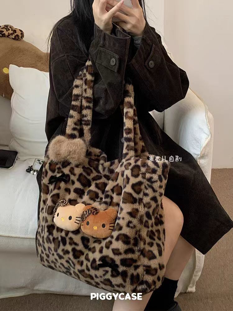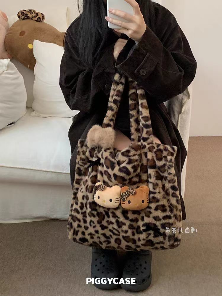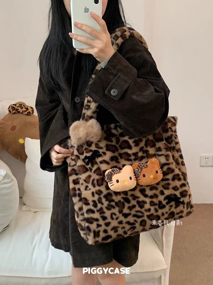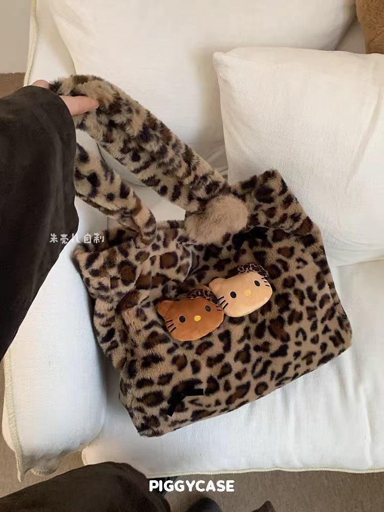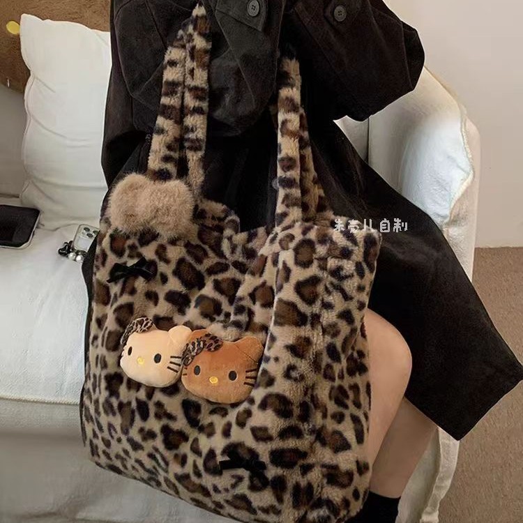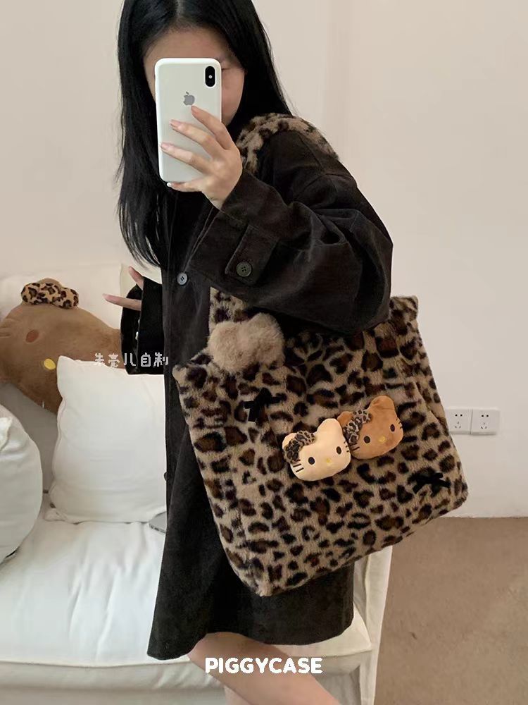 新款毛绒绒豹纹Hello Kitty包托特毛毛大容量单肩包包慵懒风可爱