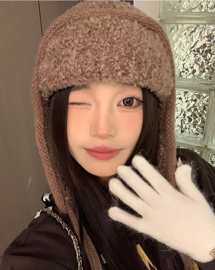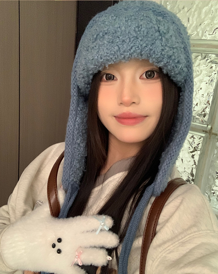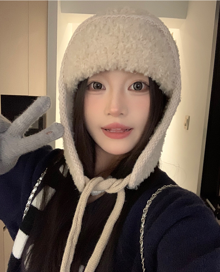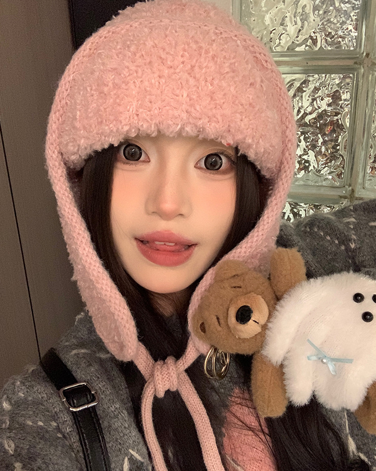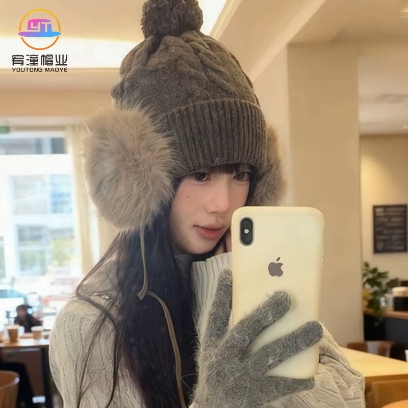 韩系小众复古麻花针织帽毛球系带护耳帽冬季2025新款保暖包头帽