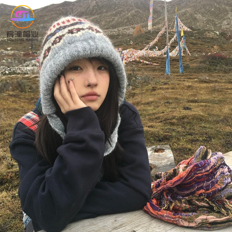 费尔岛风巴拉克拉法帽女款秋冬季保暖防寒显脸小针织毛线帽包头帽