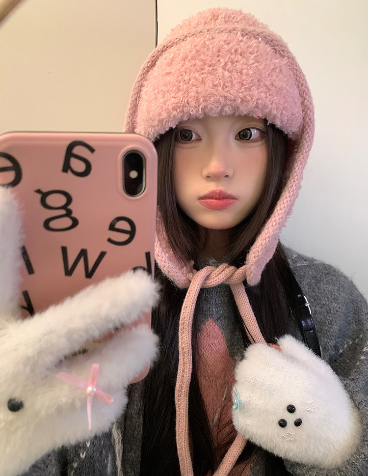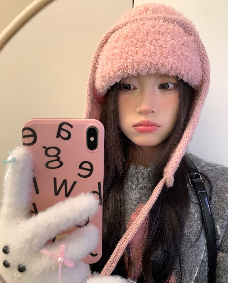 2025新款秋冬季百搭可爱兔耳麂皮绒纯色毛绒帽加厚防寒骑行护耳帽