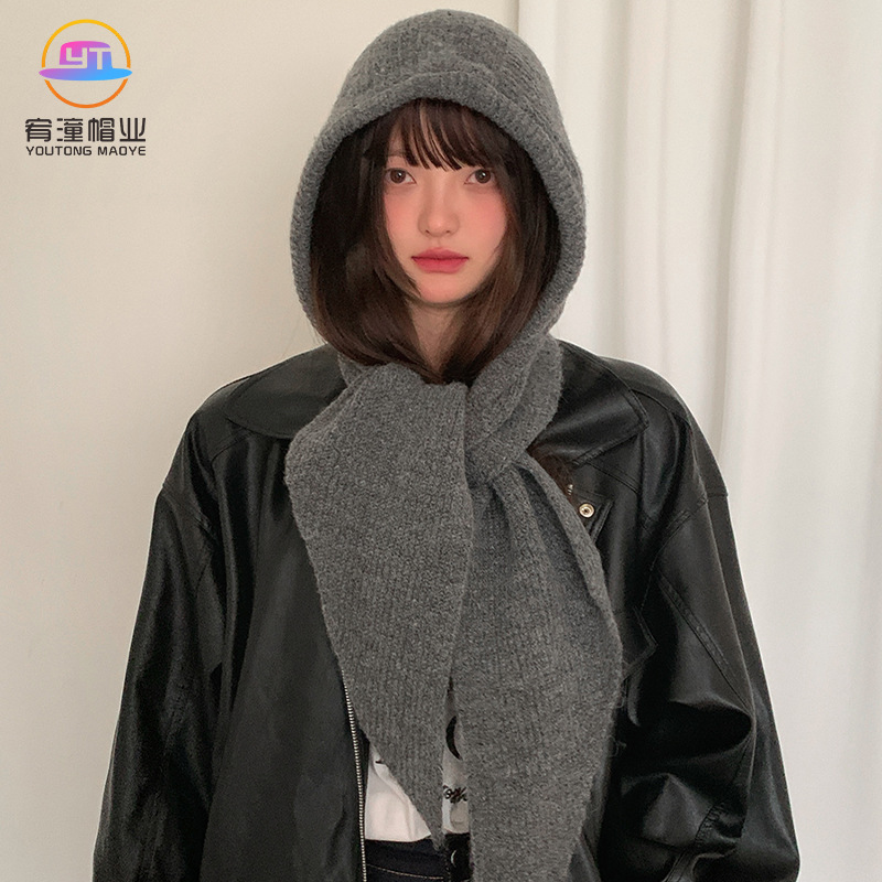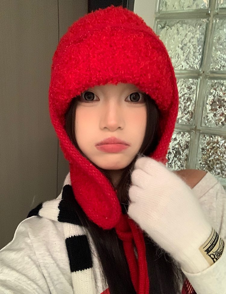 红色巴拉克拉法帽女秋冬季保暖毛线帽子围巾一体连帽围脖针织帽潮