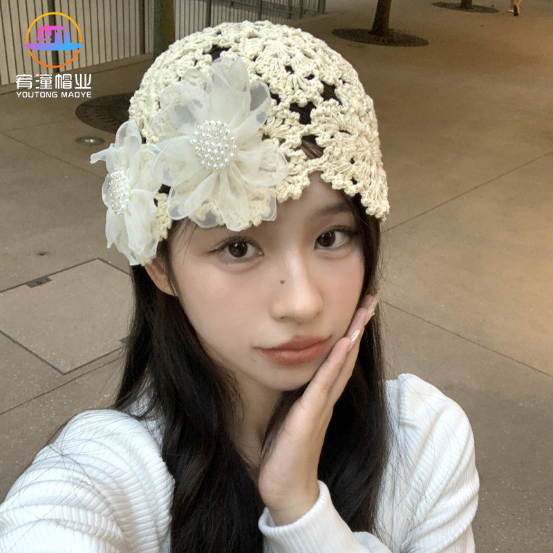 夏の薄いタイプの韓国系の透かし彫りの真珠の花の手作りのニットの包頭帽子の女性の甘くてかわいい洋風の小さい大衆の帽子