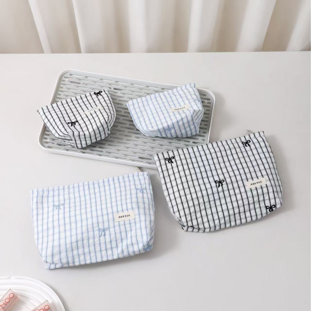 清新简约格子蝴蝶结刺绣布艺化妆包便携旅行收纳包大容量手拿包