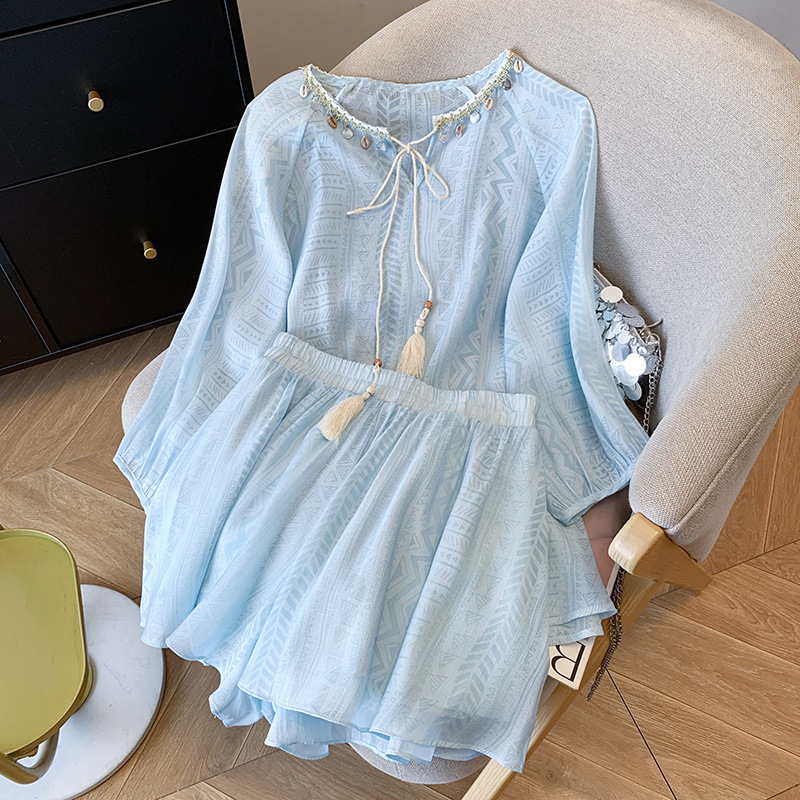 夏のファッションスーツ 2025 新しいシェル装飾襟シャツ女性のルーズワイドレッグショーツスカートツーピーストレンディなセット