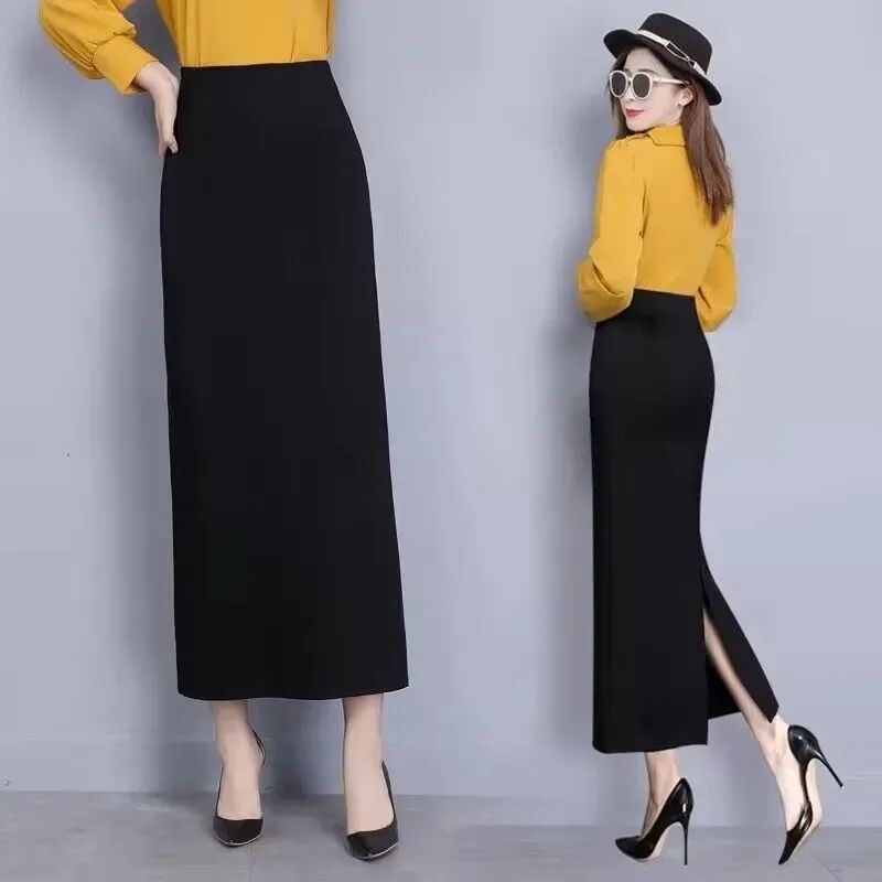新款包裙高腰百搭半身裙显瘦裙子直筒黑色中长款开叉长裙秋冬一步