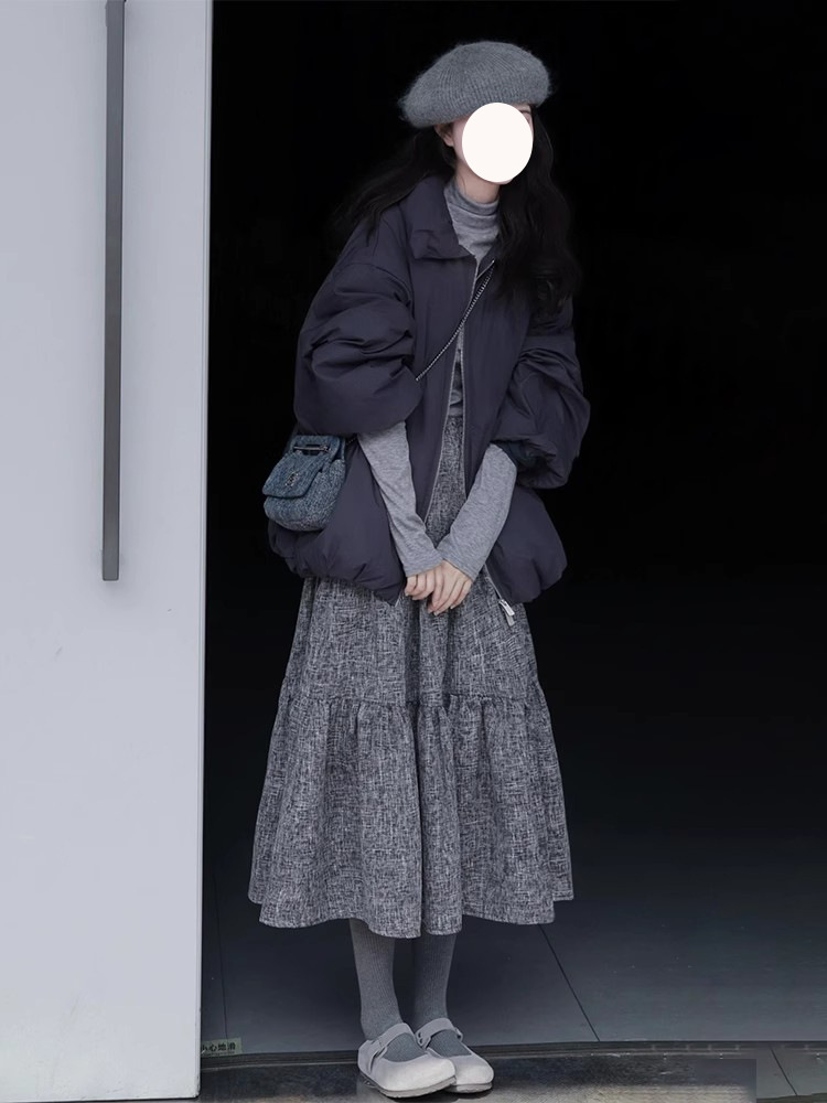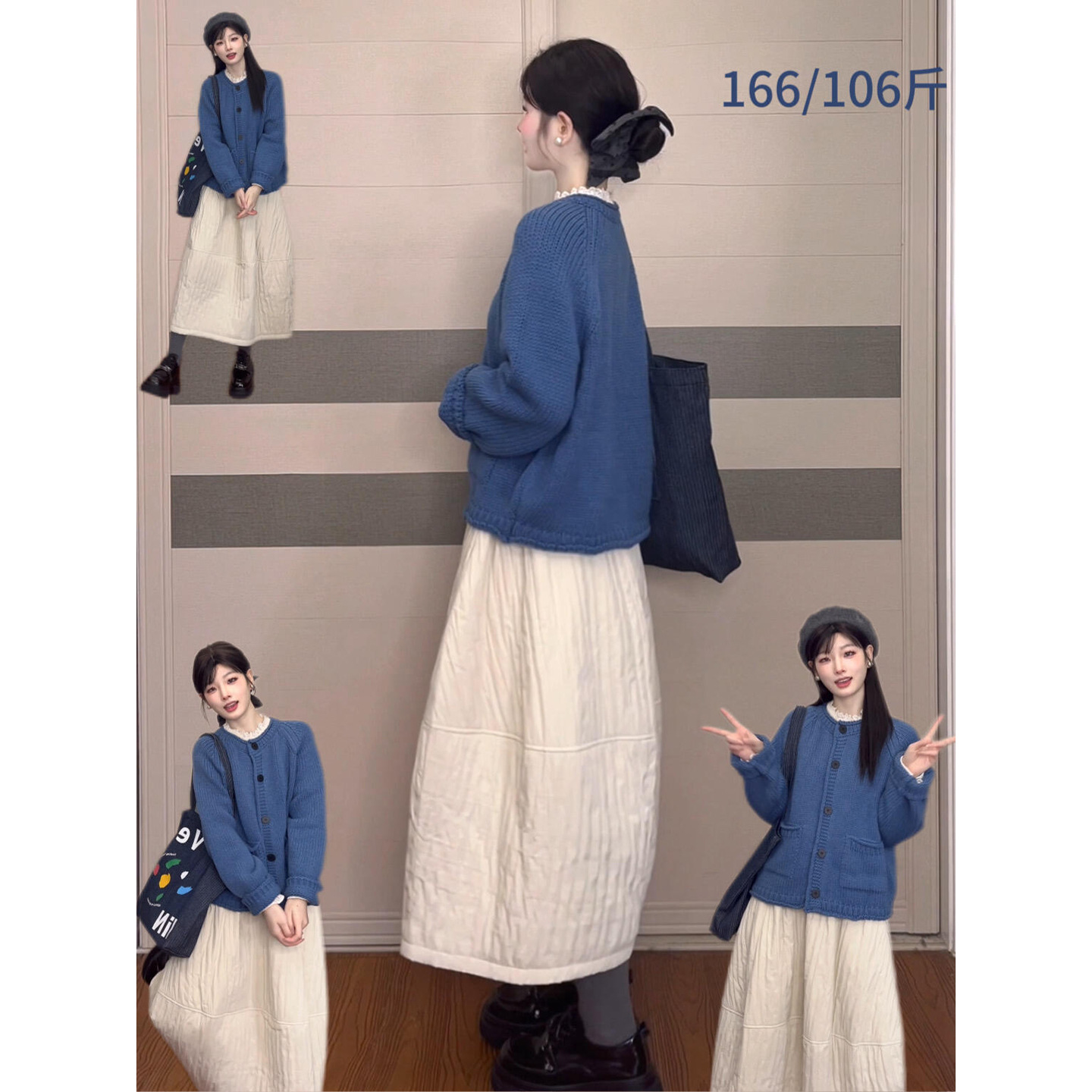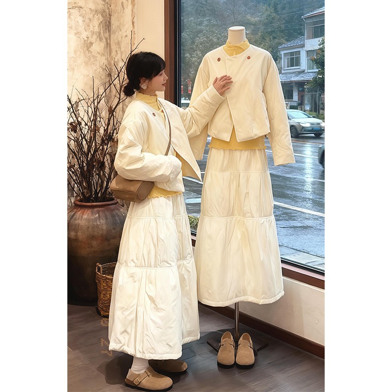 简约气质白色短款棉衣外套内搭长袖打底衫收腰半身裙套装