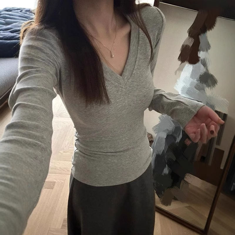 2025秋冬新款德绒V领正肩长袖t恤女内搭打底衫修身基础款辣妹上衣