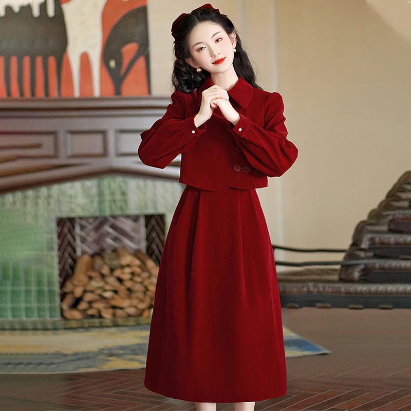 赤いチャイナドレス2025新型絶美中国式復古民国風小洋服大さん婚約タキシード修身