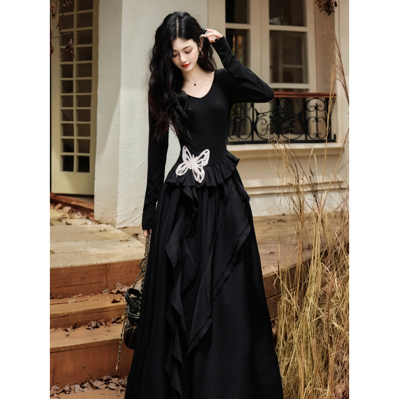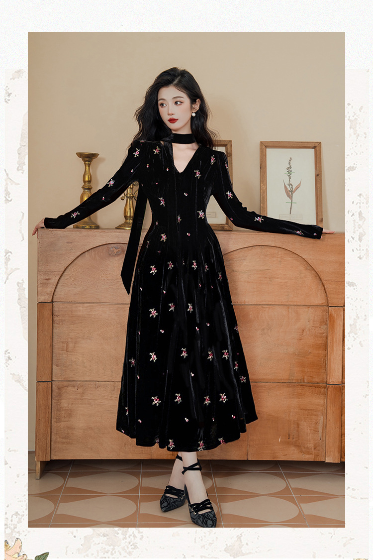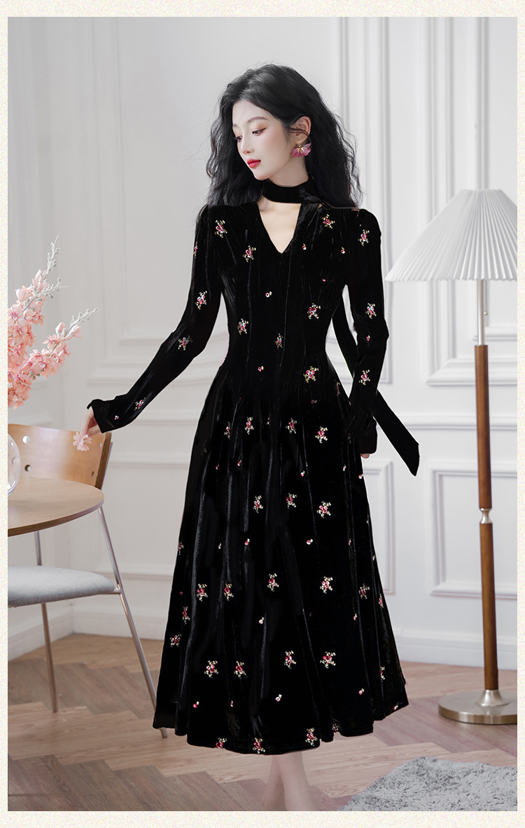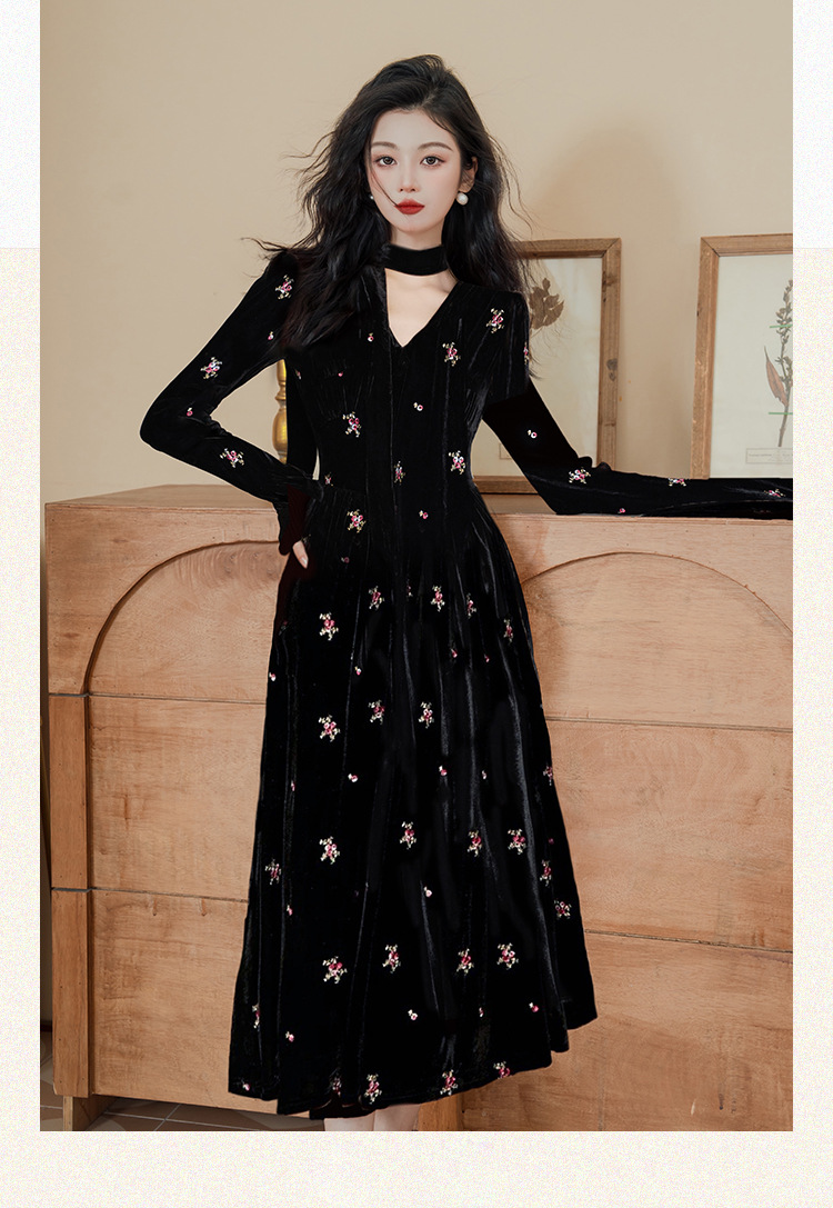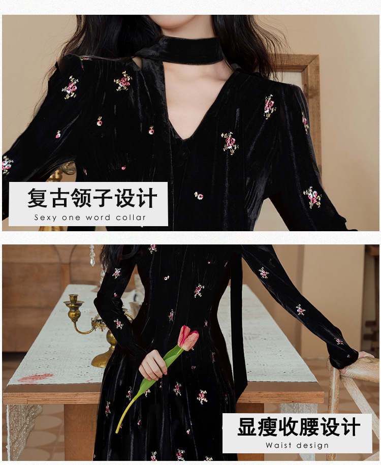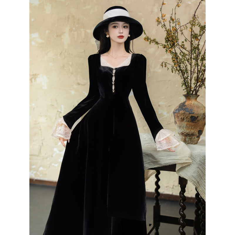 フレンチレトロ風黒ベルベットワンピース レディース 2025秋冬 高級感 気質 大人御姐風 スリムロングスカート