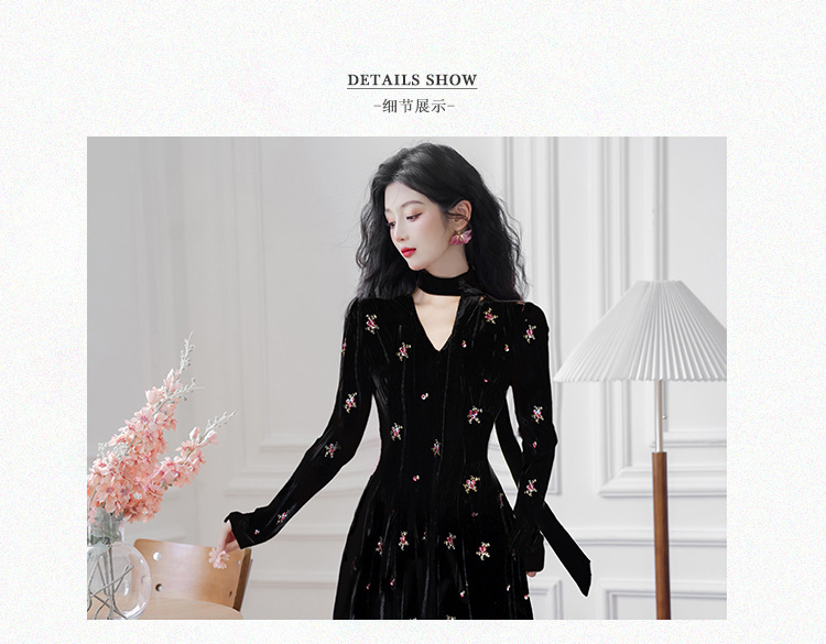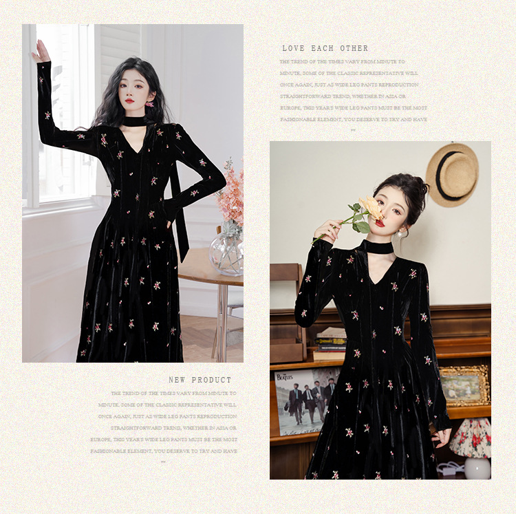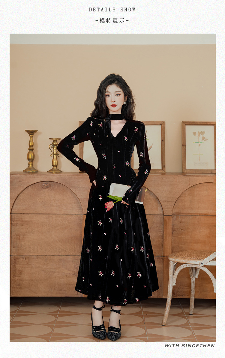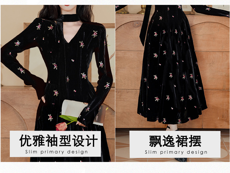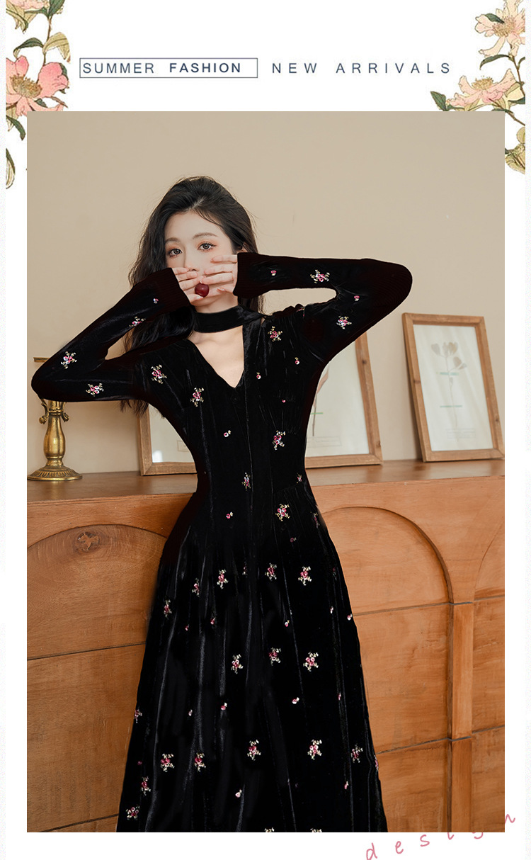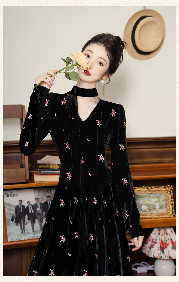 フレンチレトロ風黒ベルベットワンピース レディース 2025秋冬 高級感 気質 大人御姐風 スリムロングスカート