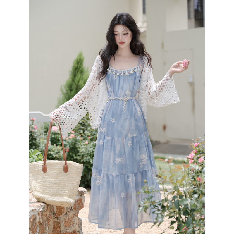 夏の美しい小さなスカート、超見栄えの良い、ユニークで美しいブルーのサスペンダードレス、海辺の休暇ビーチロングスカート