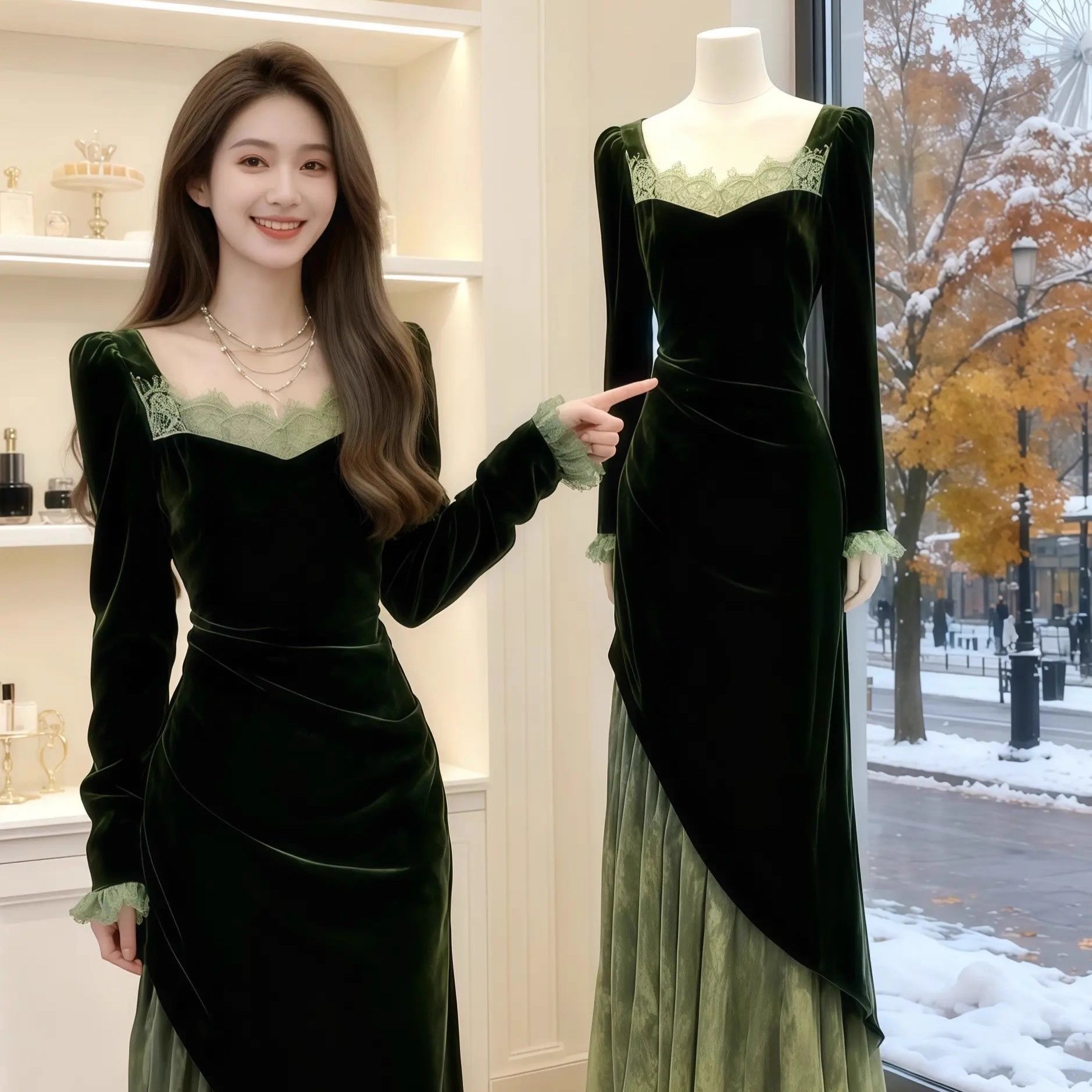 秋冬新款法式长袖绿色丝绒连衣裙2025蕾丝拼接高级气质长裙