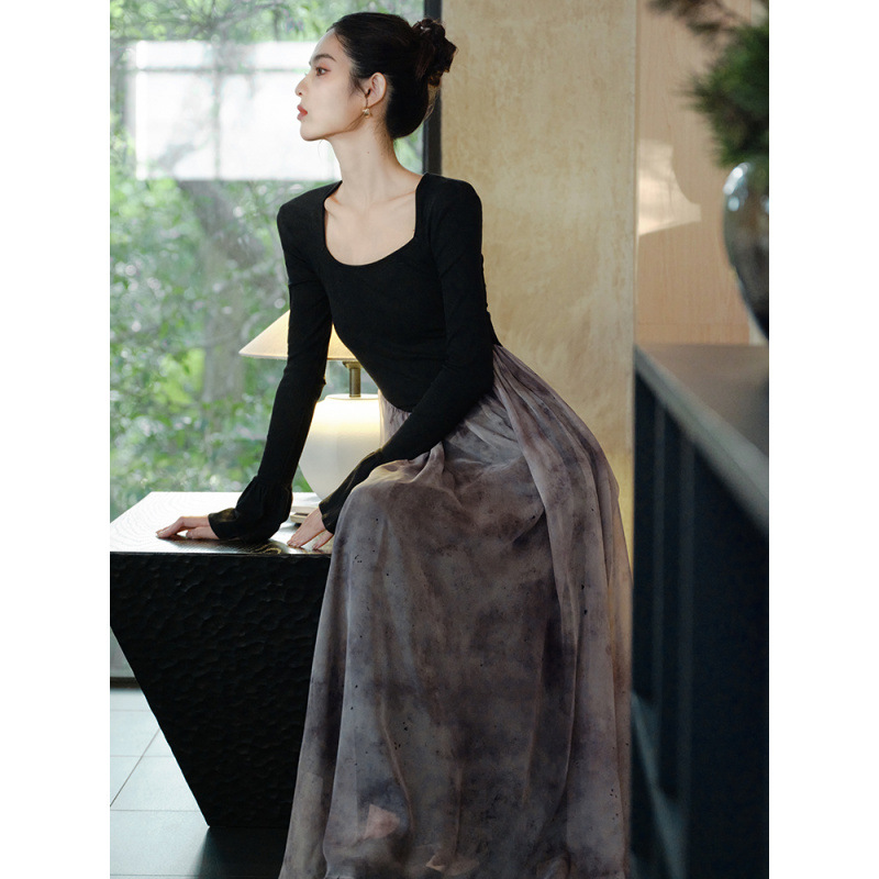 2025年秋の新作、新しい中国風レトロブラックフェイクツーピースニットドレス、ウエストを細く見せるロングスカート