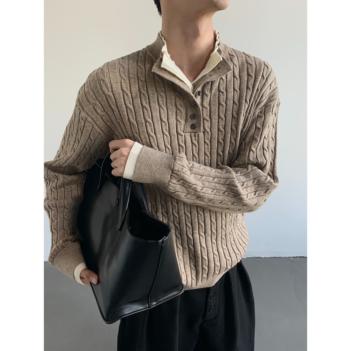 美式假两件设计麻花亨利领毛衣男女慵懒高级感宽松套头针织衫黑色
