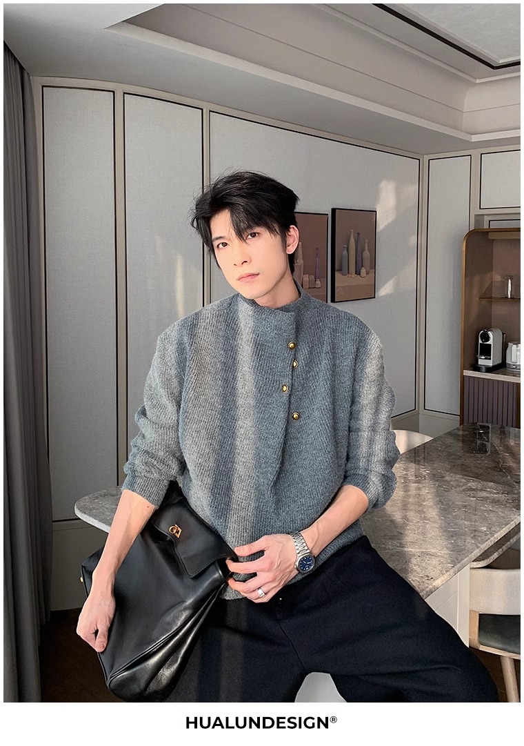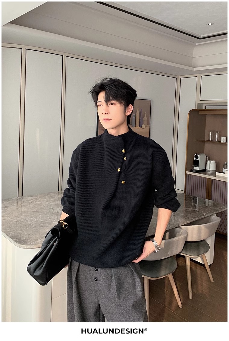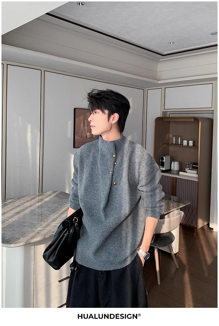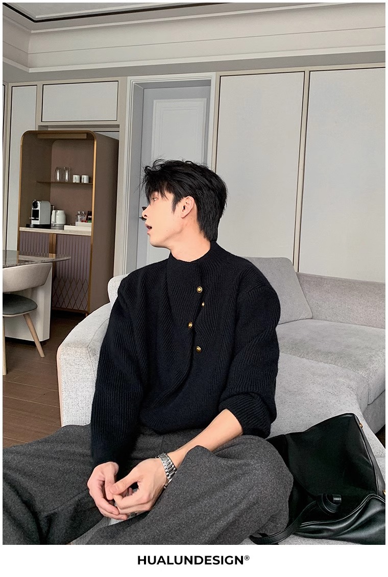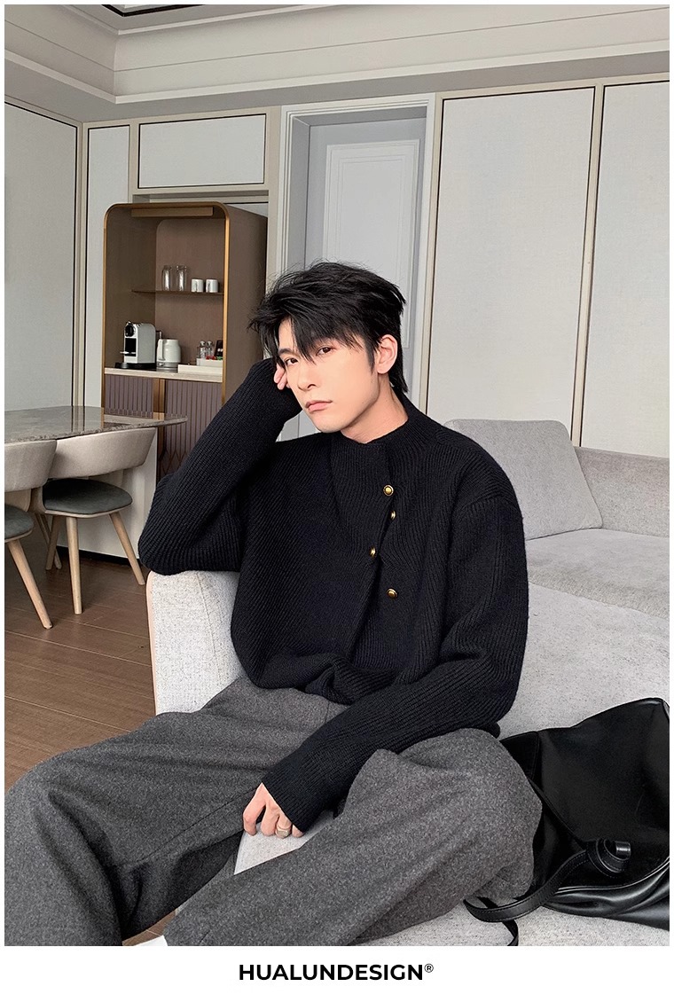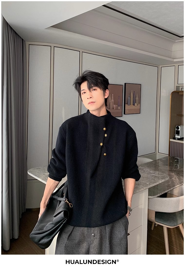不規則なボタンのデザイン感の高い襟のセーターの男性の韓国系のファッションのブランドのごろつきのハンサムで怠惰なoversizeニットの上着