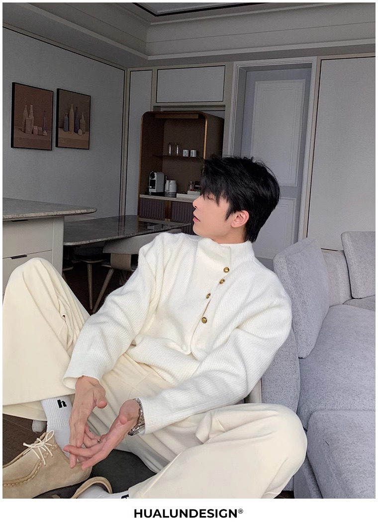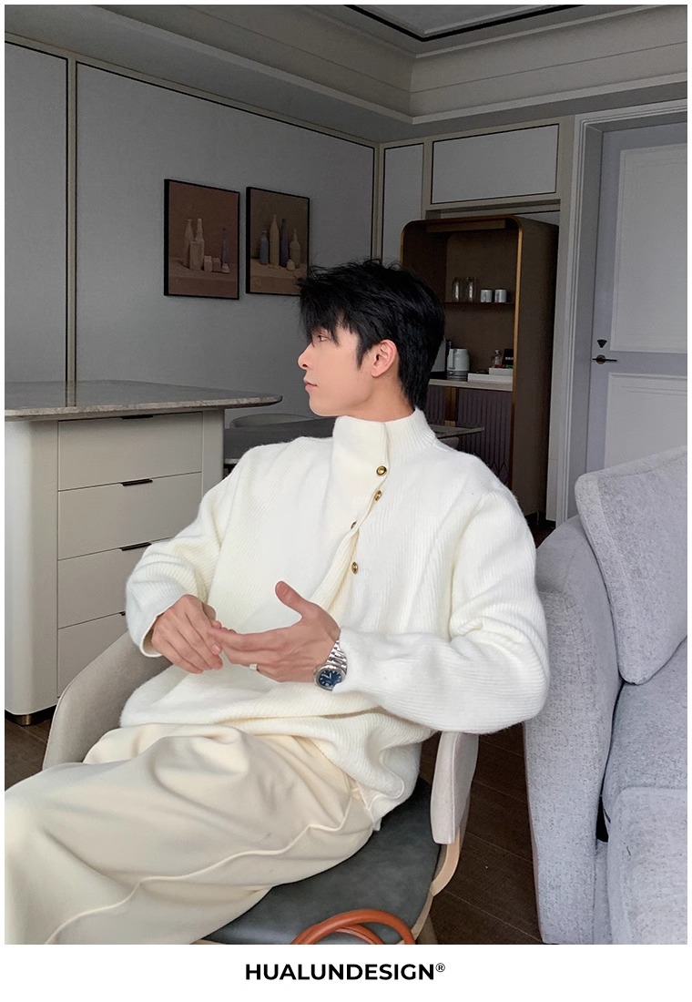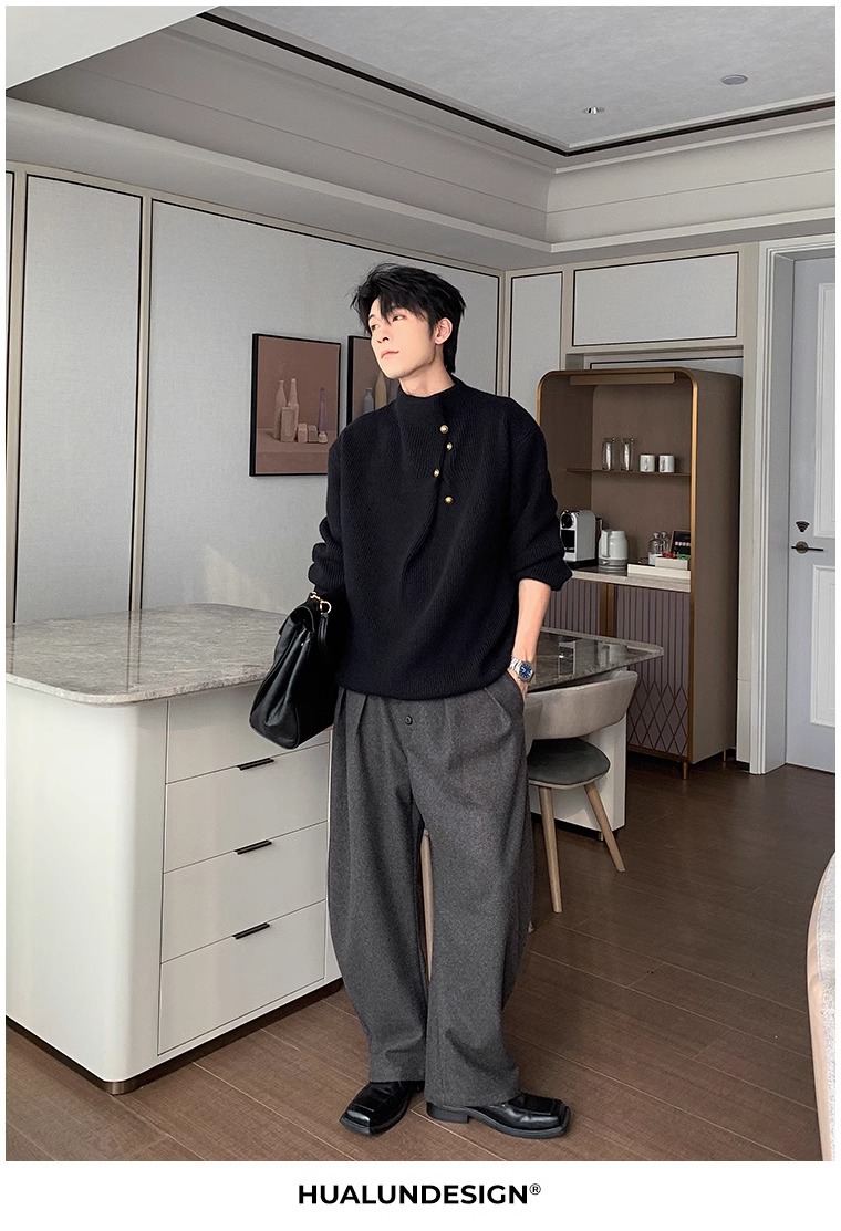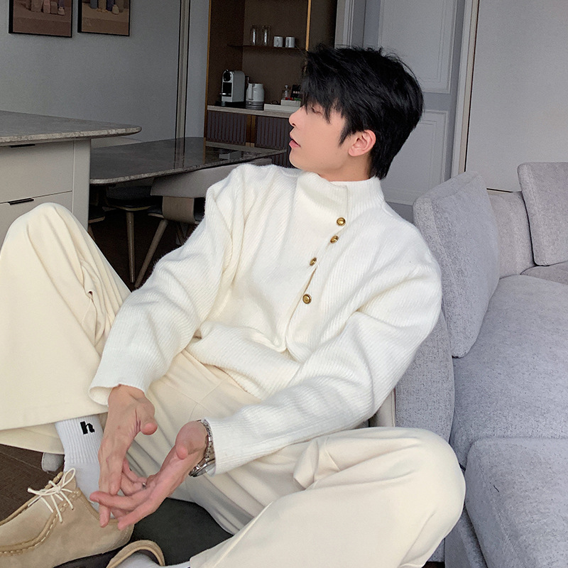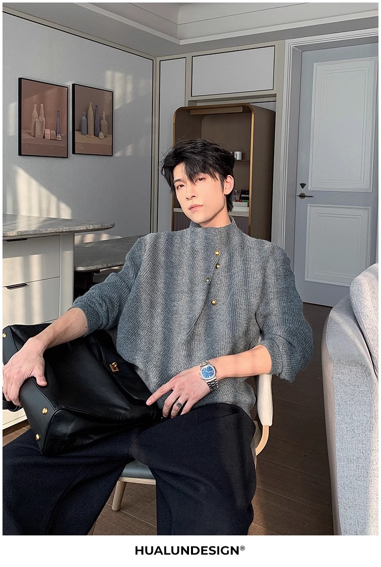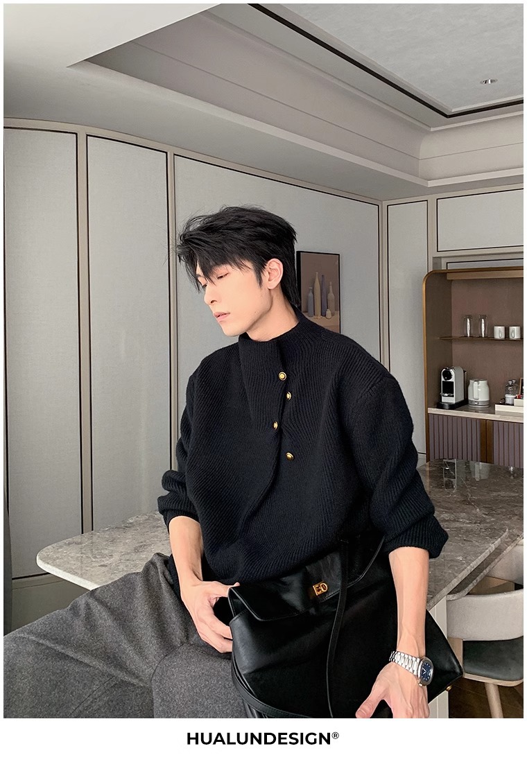 不規則なボタンのデザイン感の高い襟のセーターの男性の韓国系のファッションのブランドのごろつきのハンサムで怠惰なoversizeニットの上着