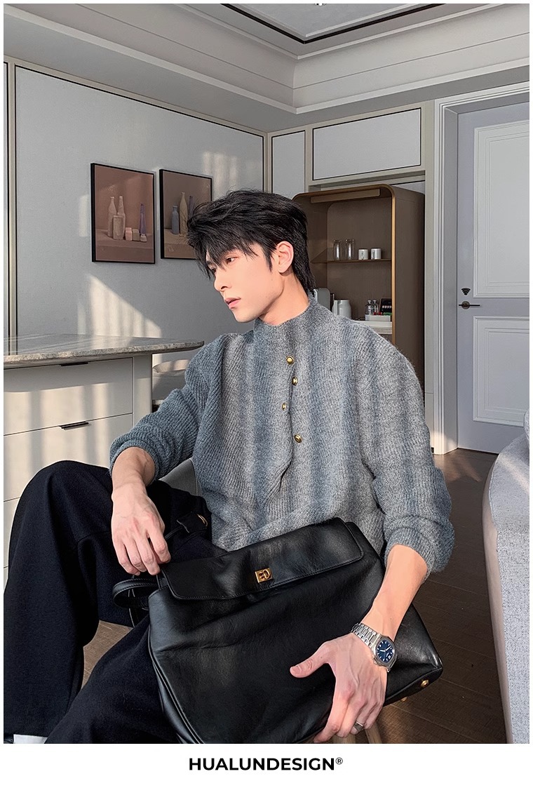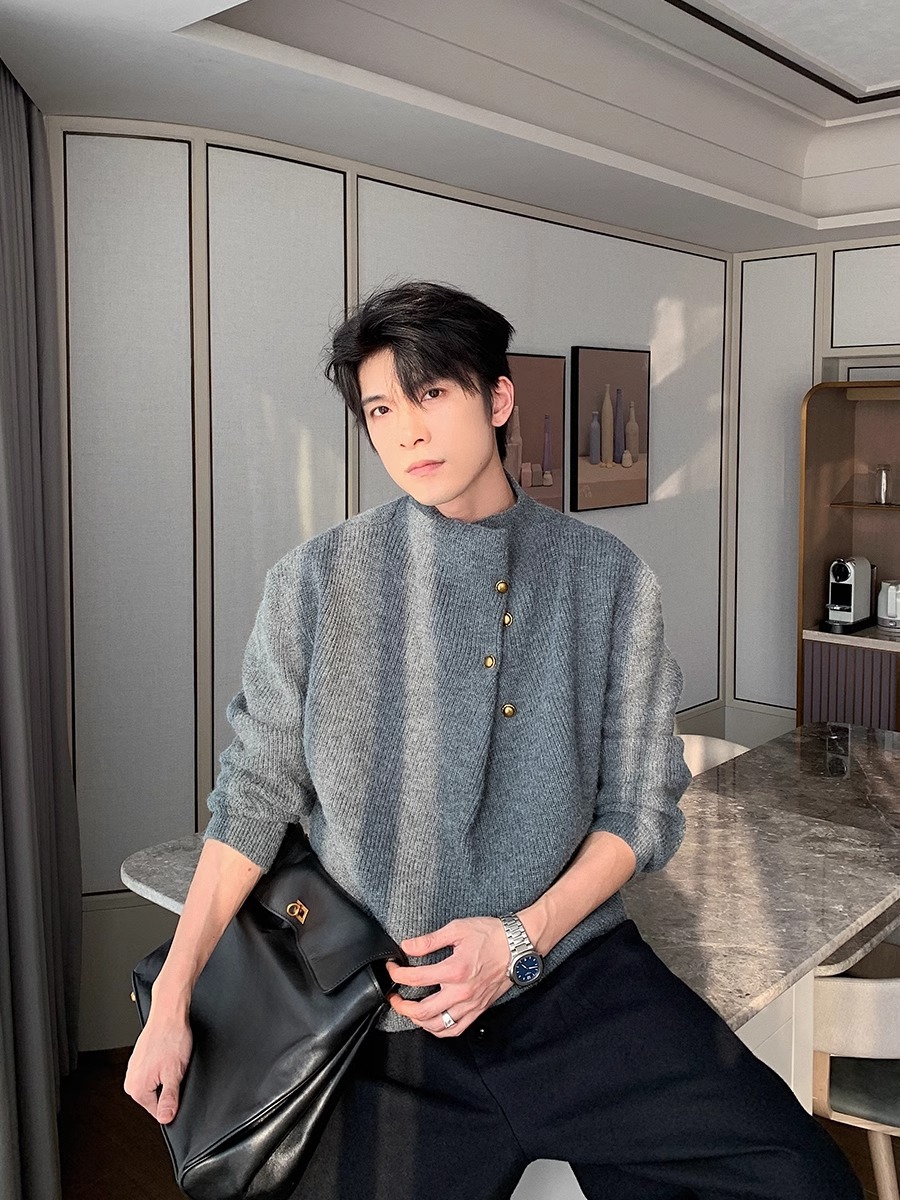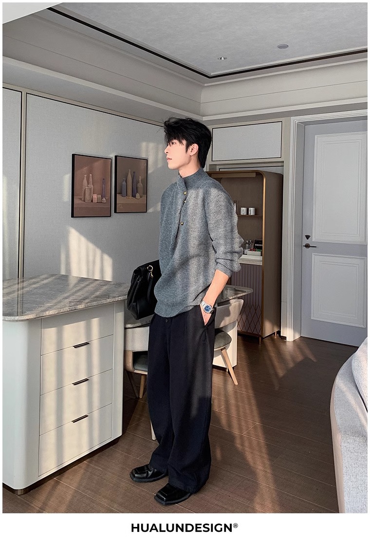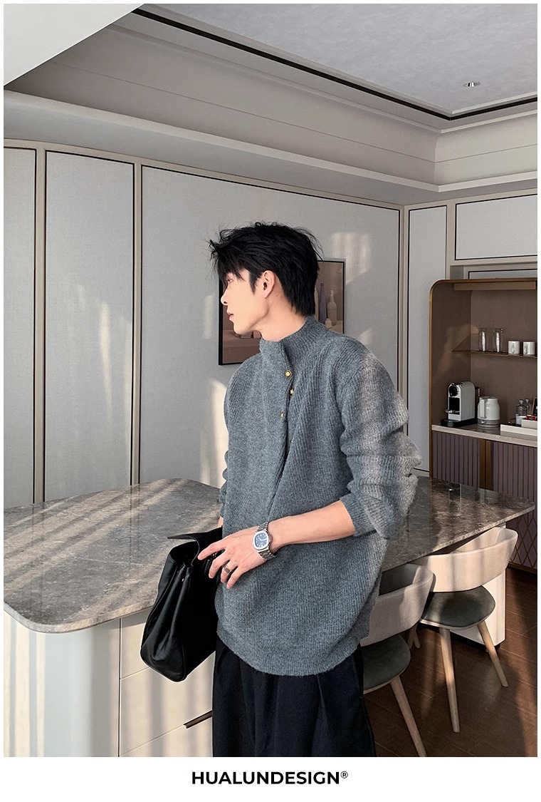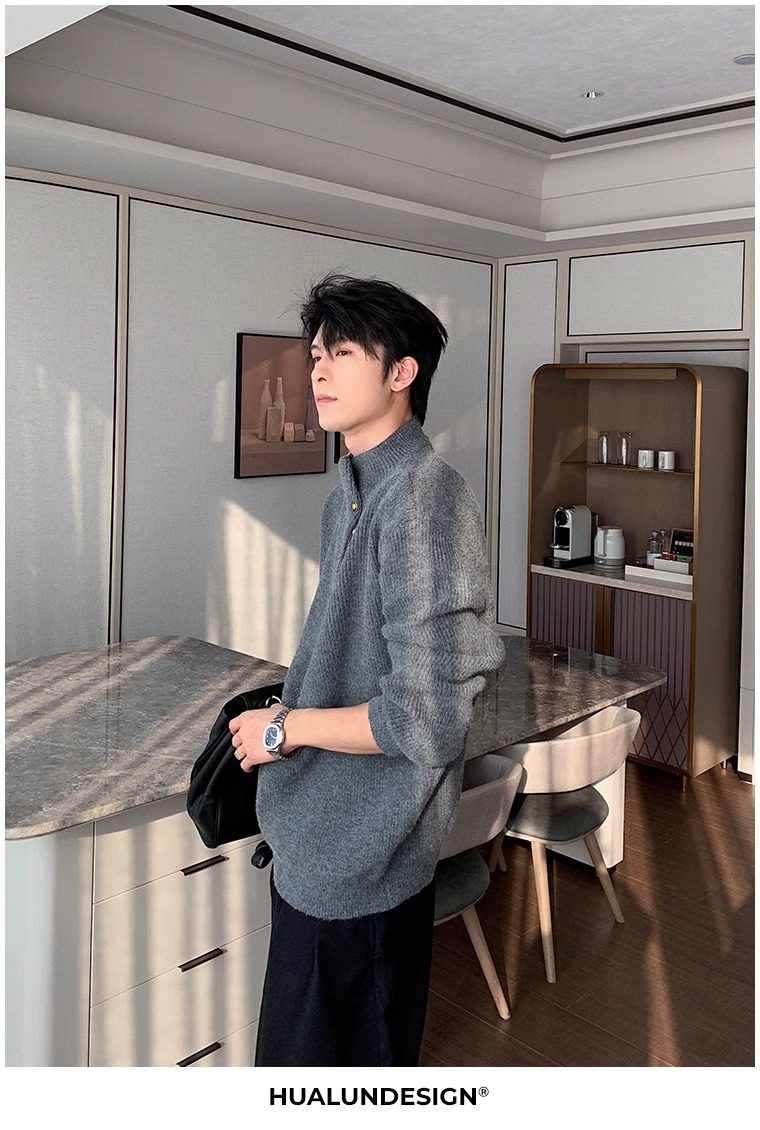 慵懒高级感亨利领毛衣男秋冬款韩系潮牌设计感套头软糯针织衫上衣