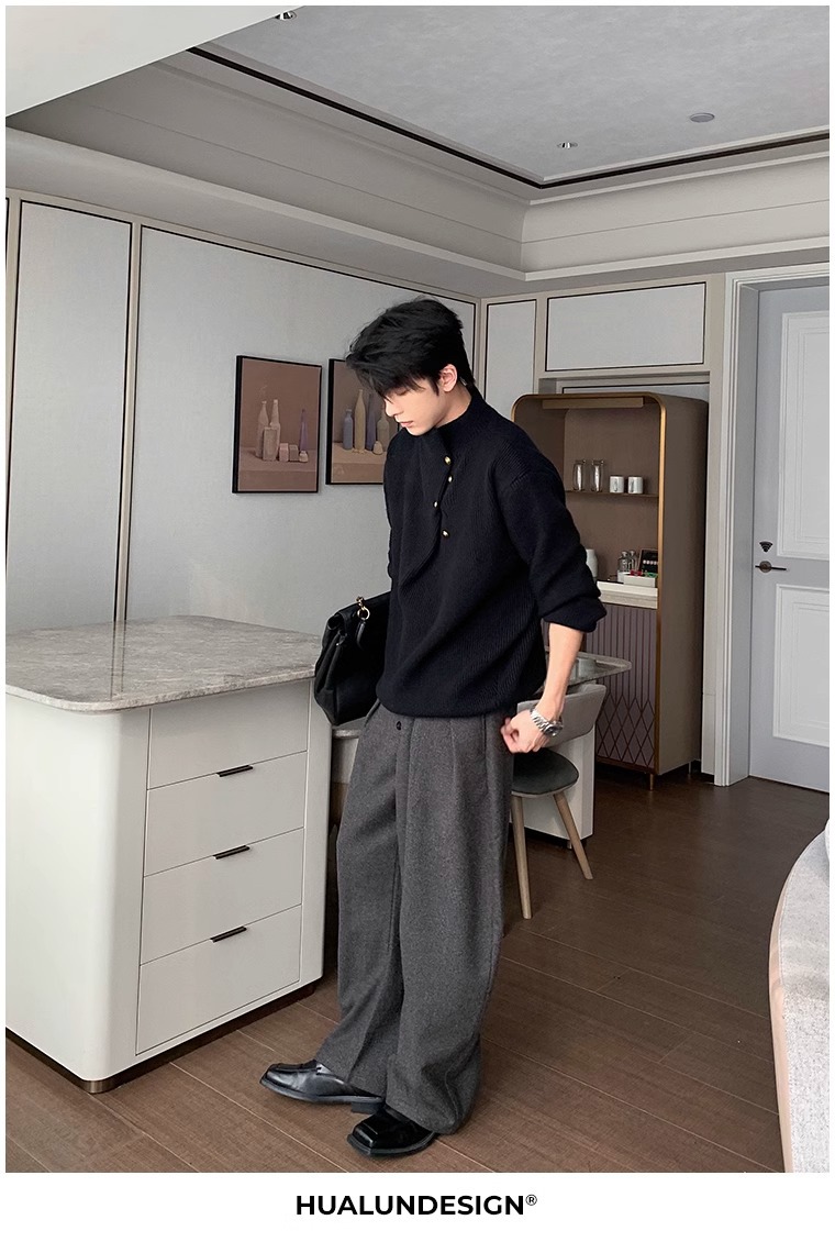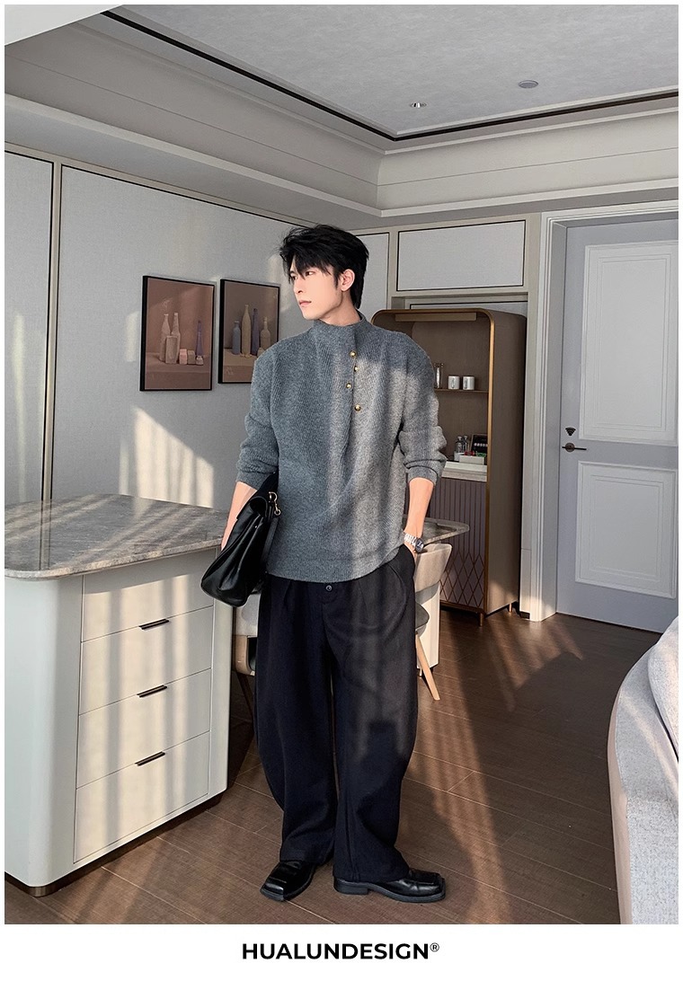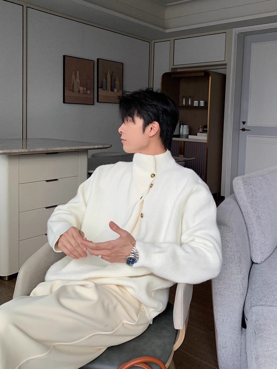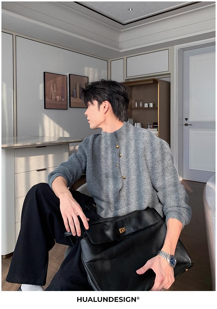 慵懒高级感亨利领毛衣男秋冬款韩系潮牌设计感套头软糯针织衫上衣
