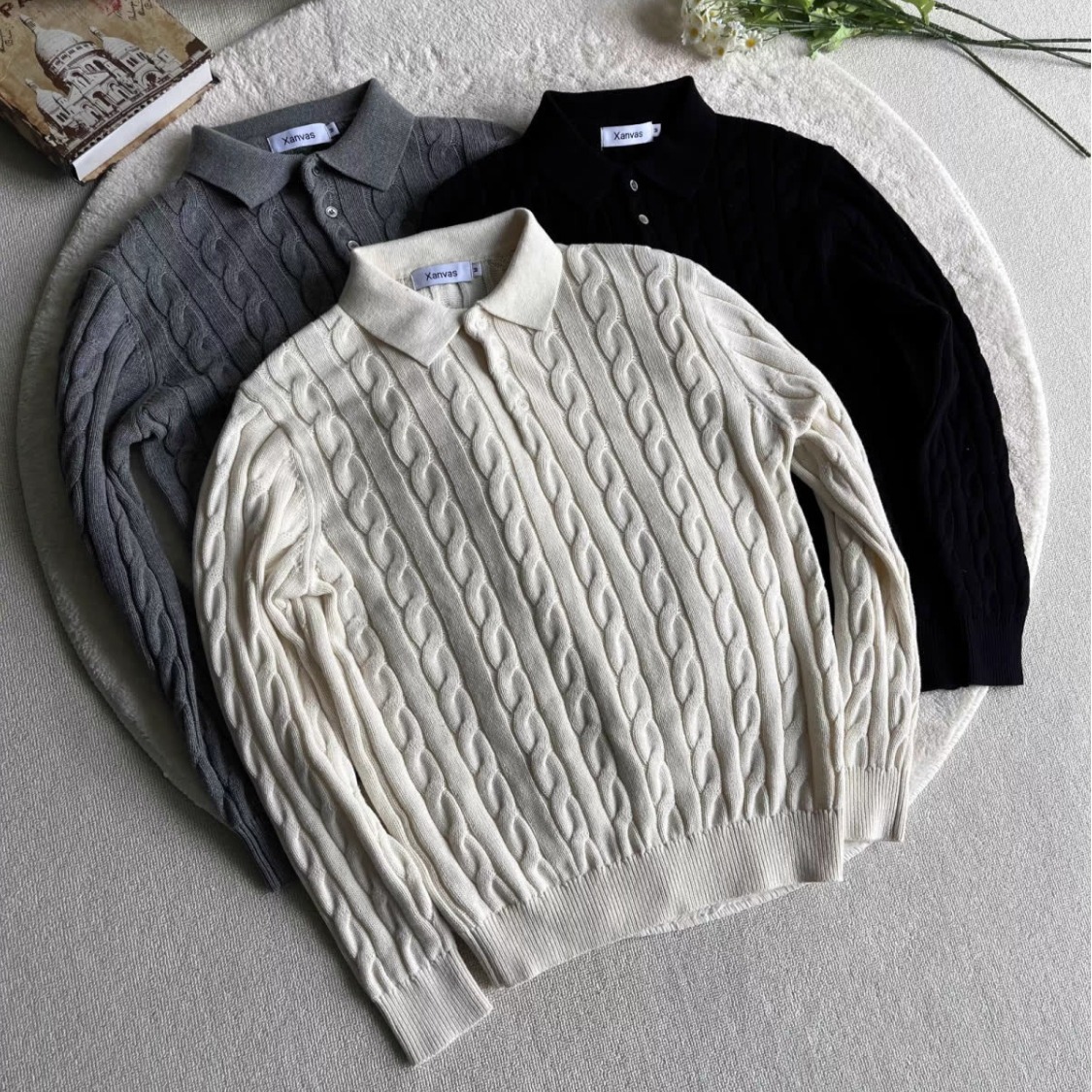 春装款百搭高级感女开衫衬衣领精致POLO领长袖毛衣羊毛打底针织衫