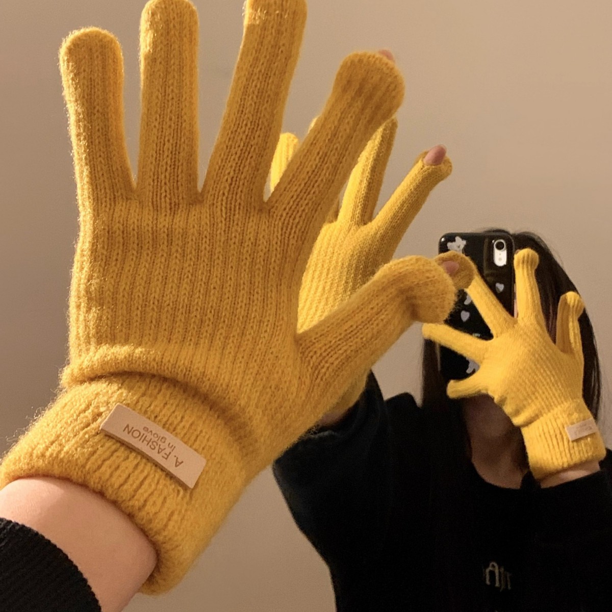 新型冬の純色ニット手袋男女保温タッチパネル毛糸五本指防寒韓国版女性