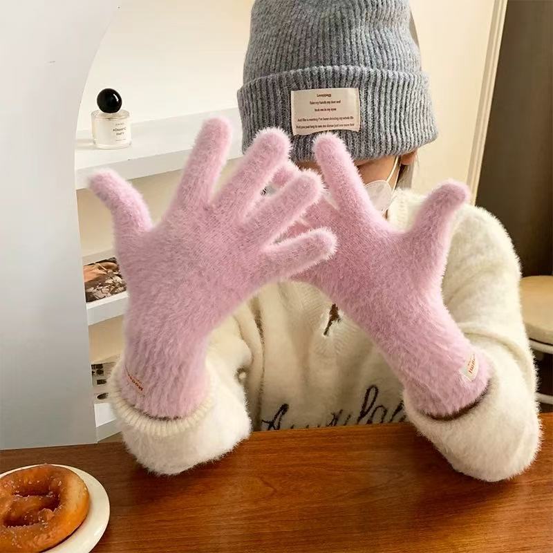 仿兔毛手套女生秋冬季可爱加绒保暖防风防寒骑行连指毛绒手套学生