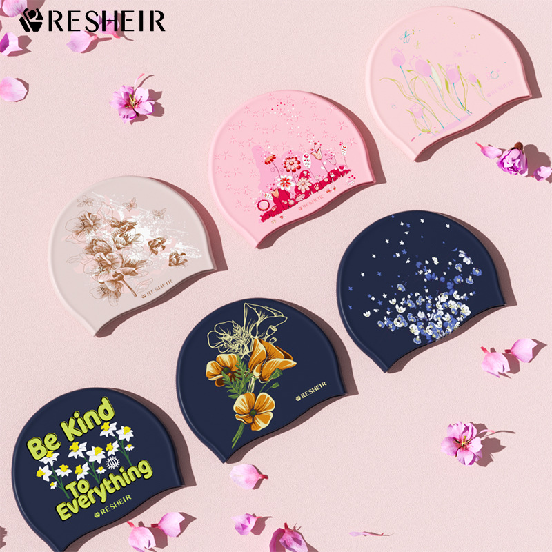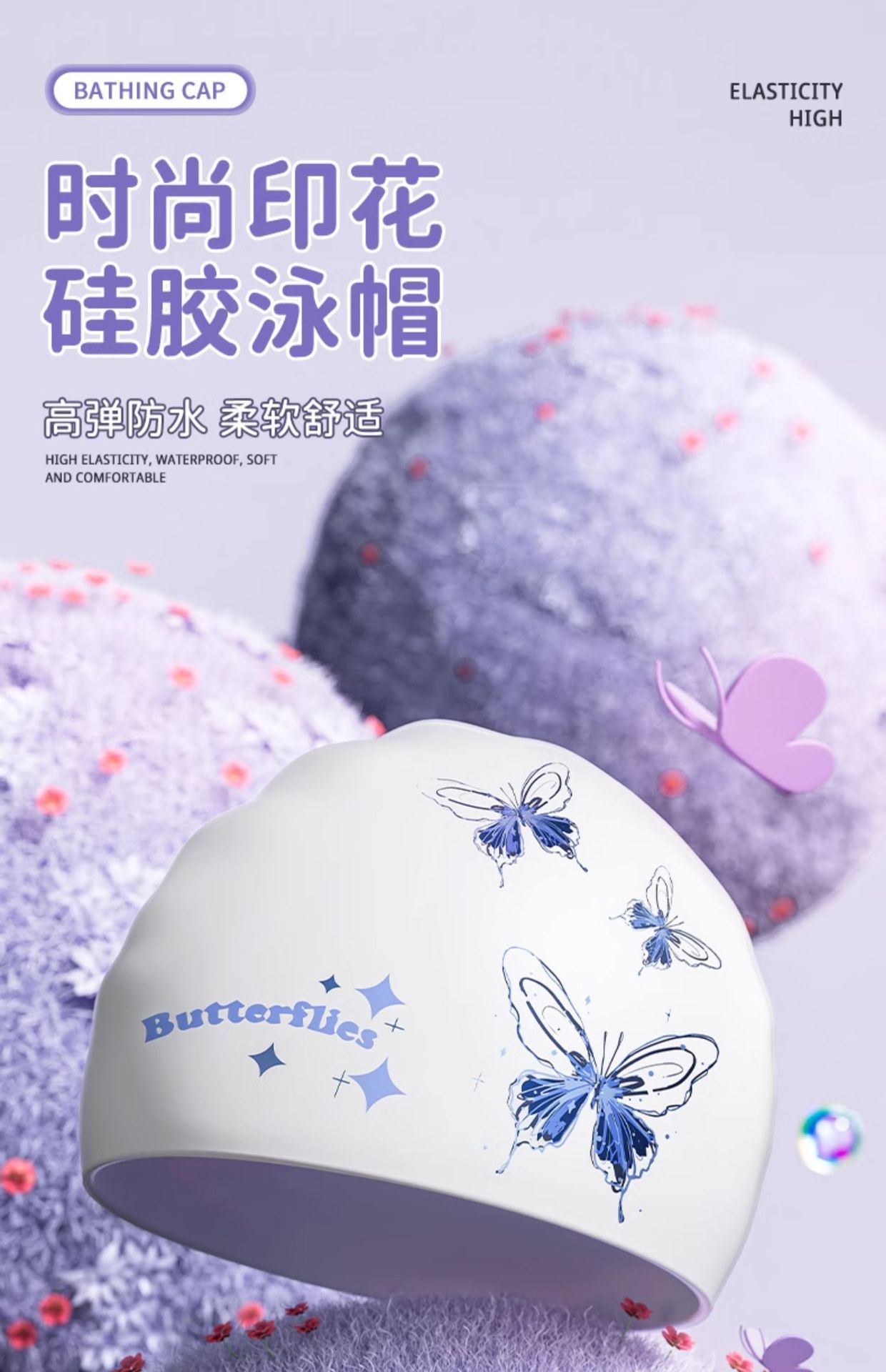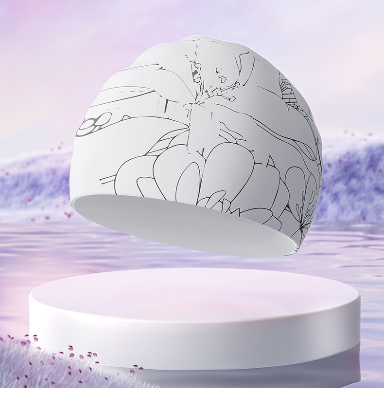 水泳帽の女性は大人の防水が快適で、首を絞めない韓国ファッションプリントのシリカゲル水泳帽メーカーが卸売りしています。