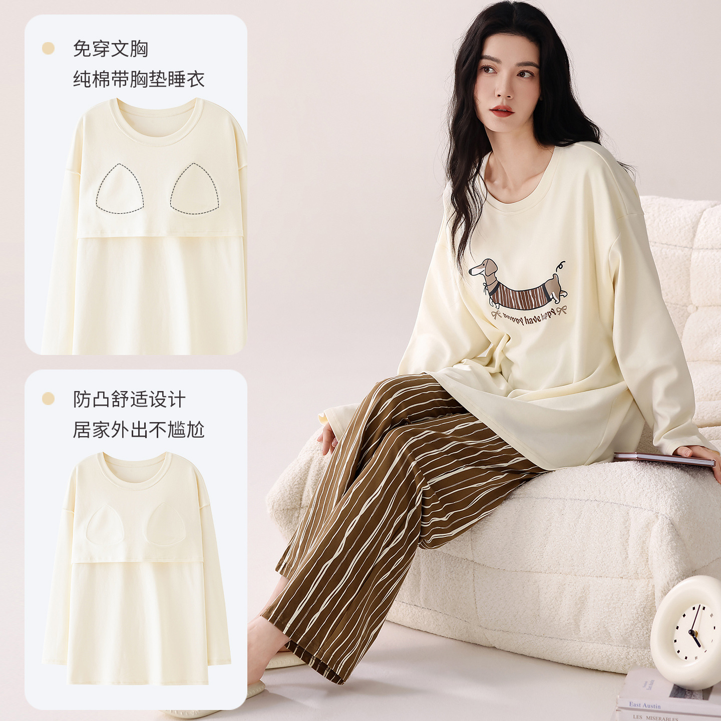 跨境批发睡衣女士春秋季纯棉长袖2025新款秋冬带胸垫可外穿家居服