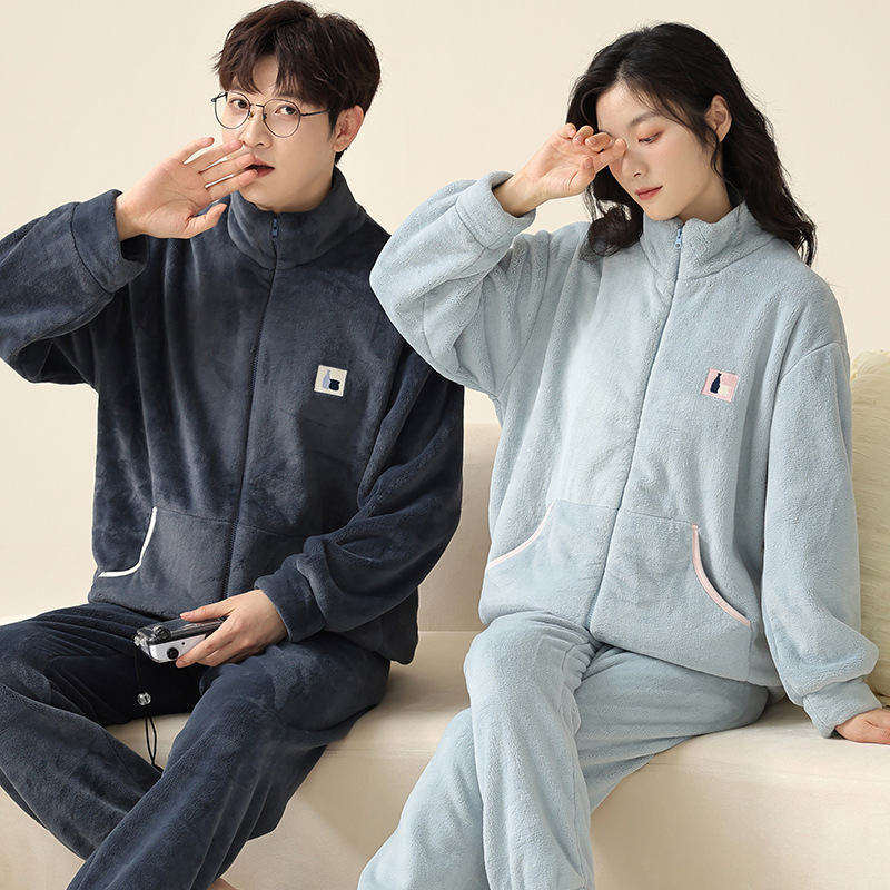 秋冬季情侣睡衣法兰绒女加绒加厚带拉链男家居服套装冬天可外穿