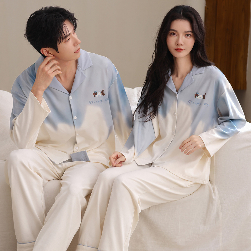 翻领开衫纯棉情侣睡衣女士男士秋季长袖长裤休闲家居服套装可外穿