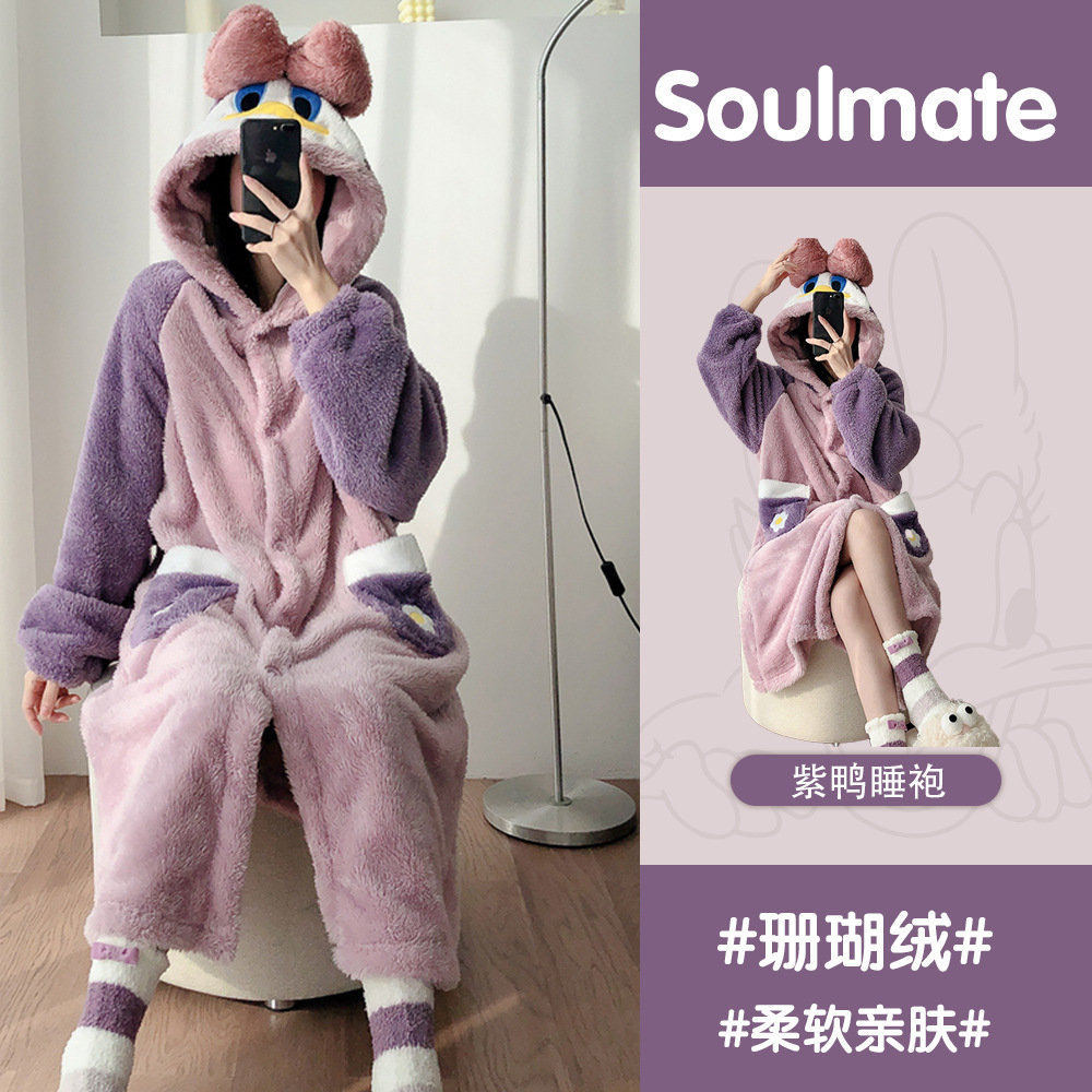 唐老鸭睡衣冬季女2025新款珊瑚绒睡袍加绒加厚长款家居服冬天睡裙