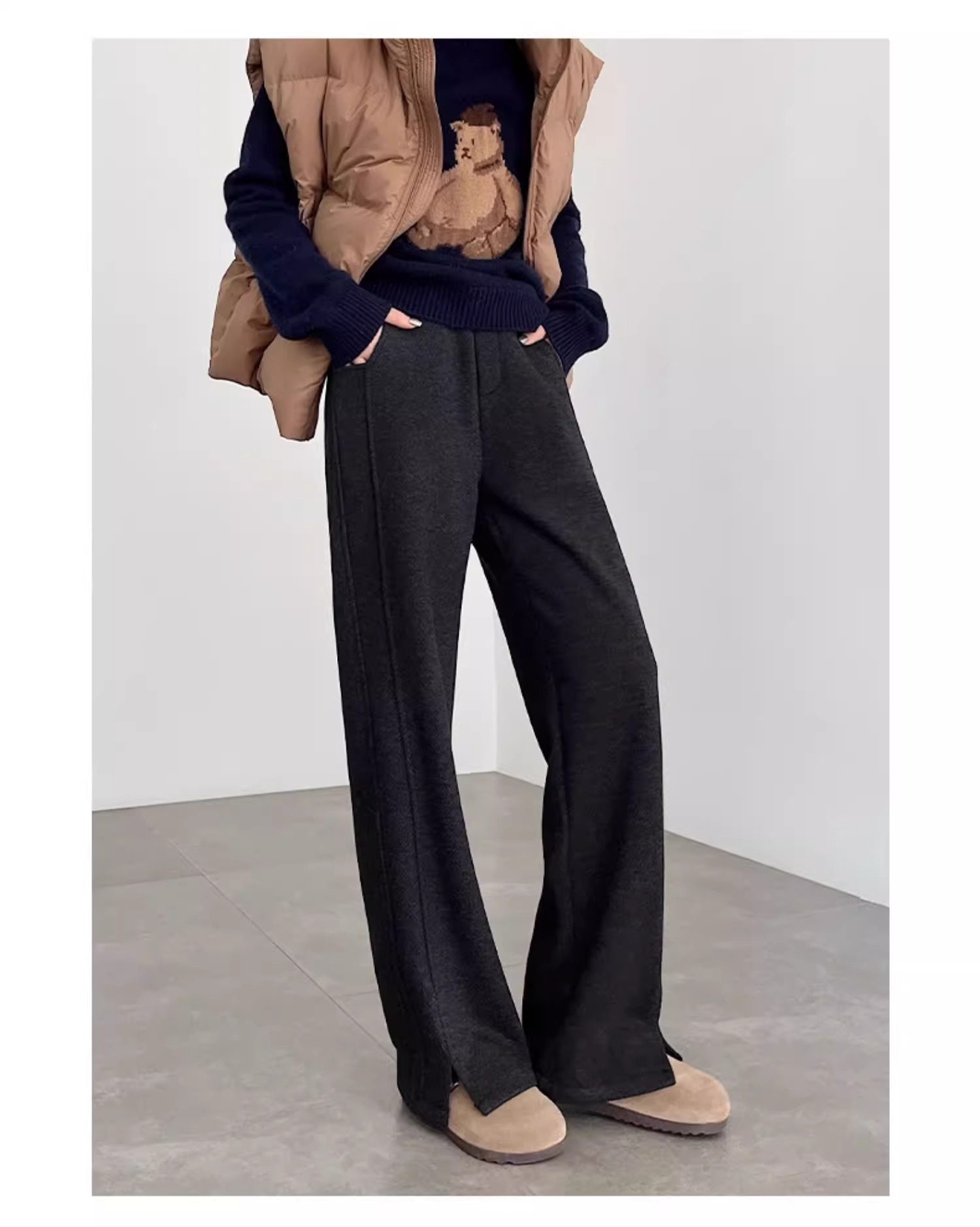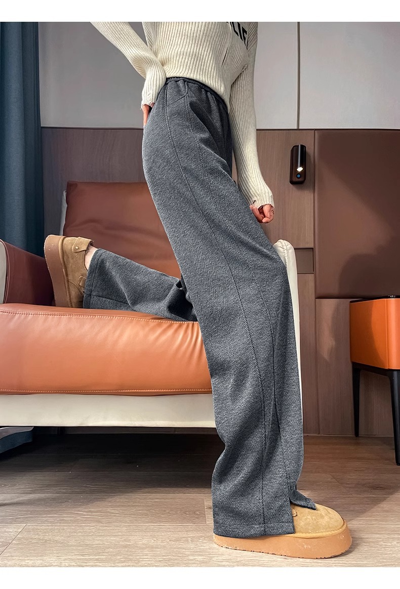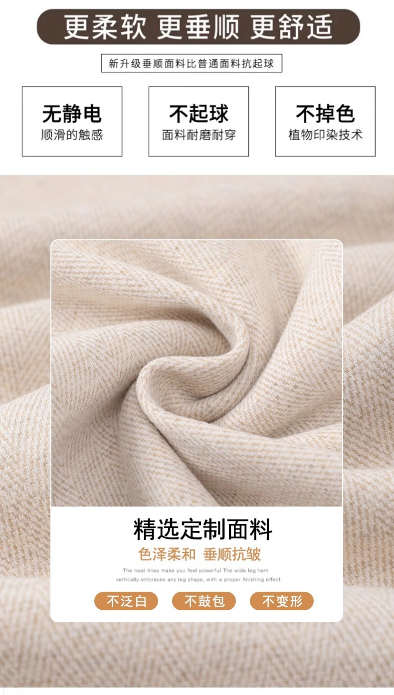 人の字の紋様のベルベットの広脚のズボンの女性の秋冬の2024の新型の毛はズボンのまっすぐな筒のウールの狭い版のバナナのズボンを開けます。