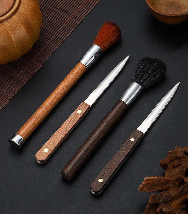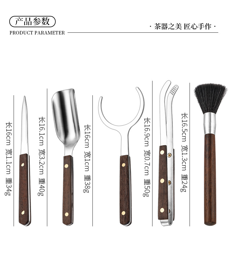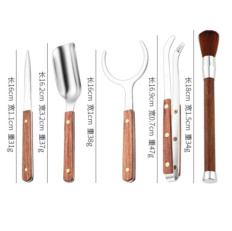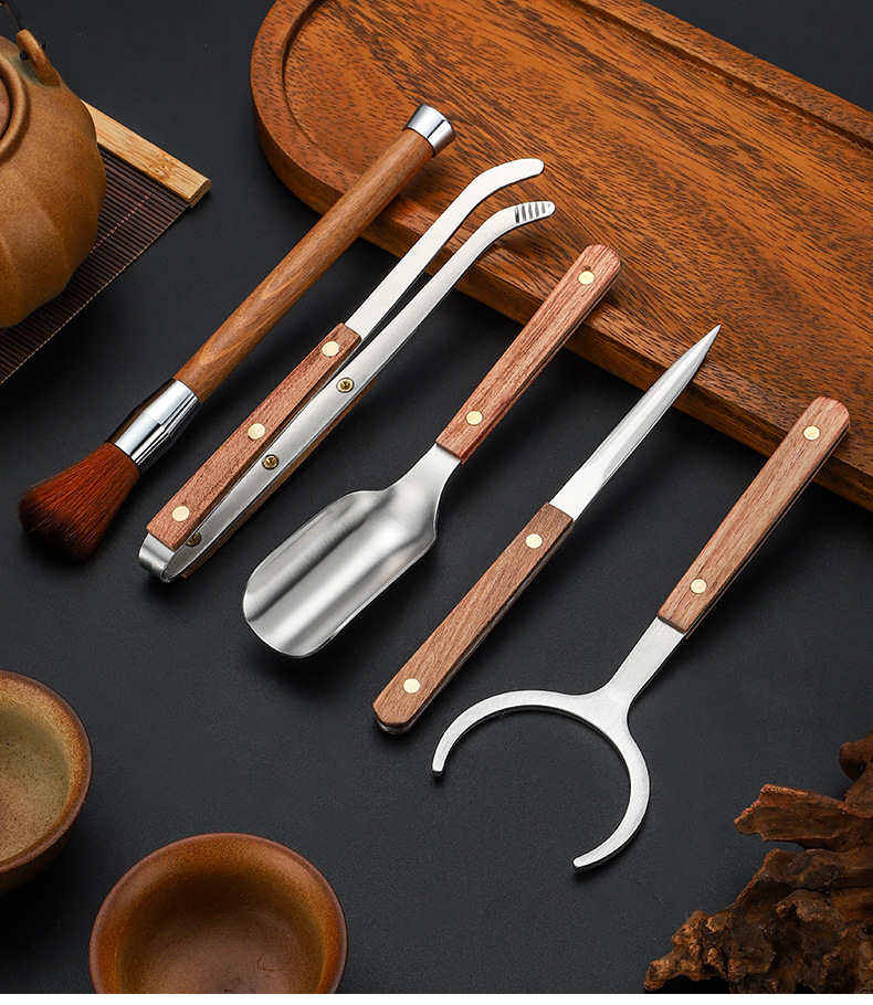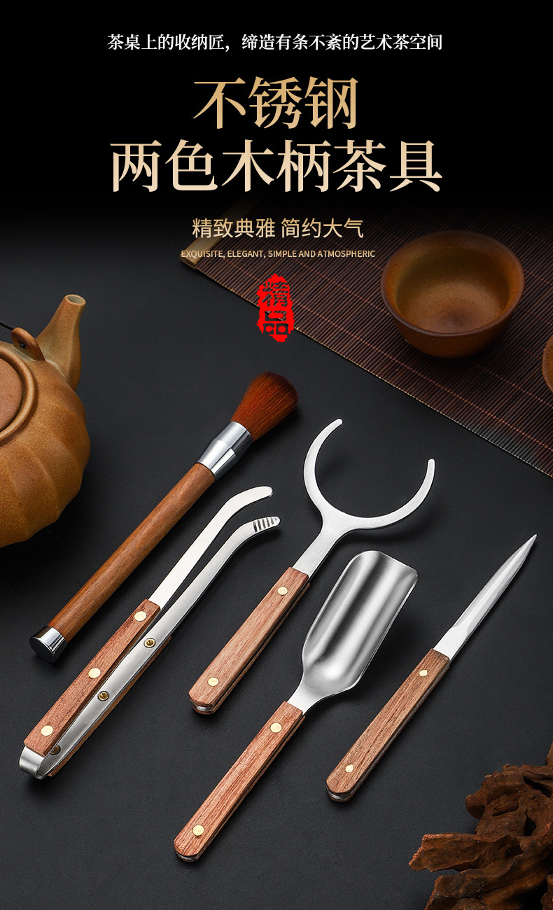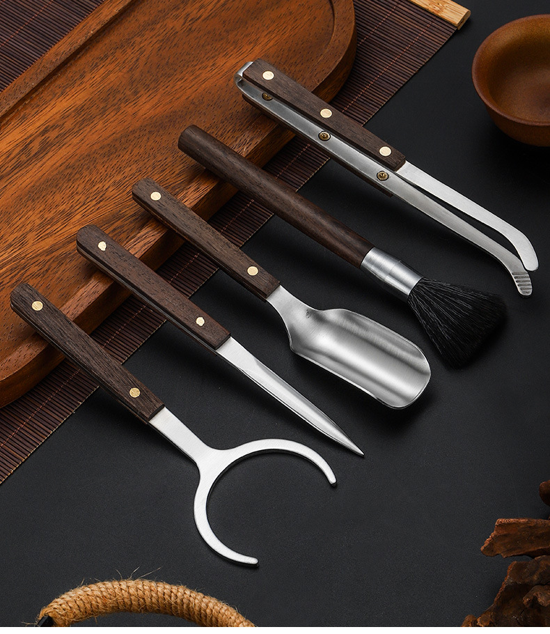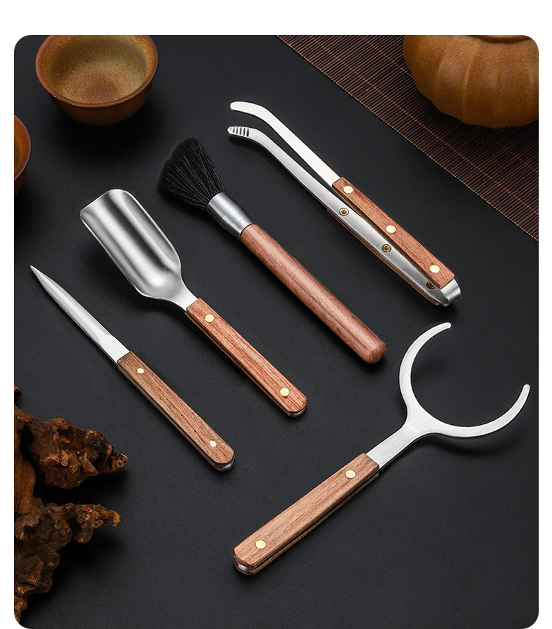 スチールウッド5点セットティーピンセットクリップ茶道アクセサリーカンフー茶道具黒檀花梨木スチールウッド5点セット