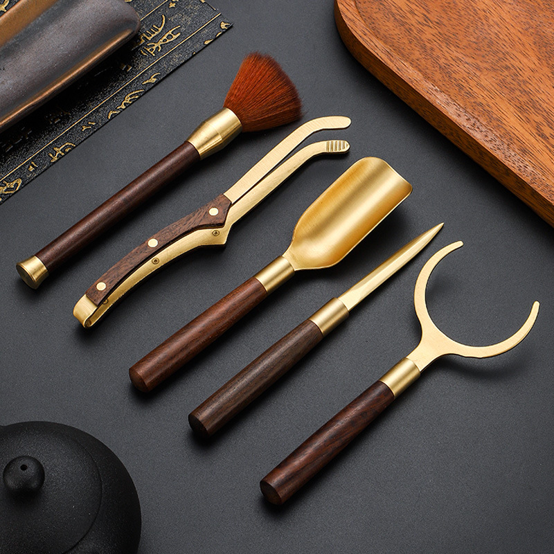 銅の木の5つのセット. 黒檀木. 花梨の木. 茶道五君子セット茶道具部品茶さじ茶刀