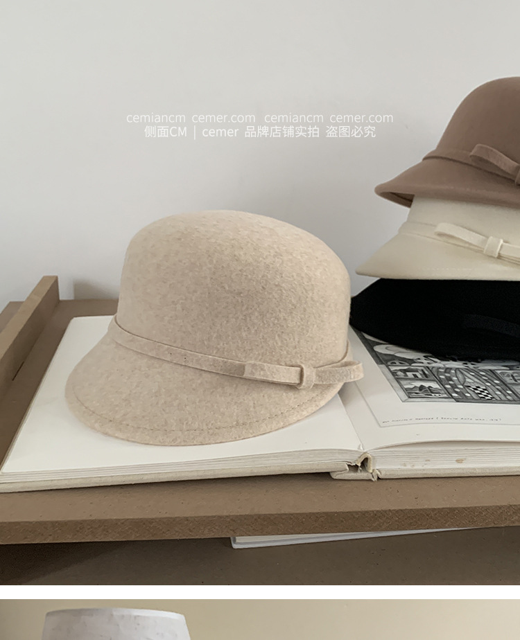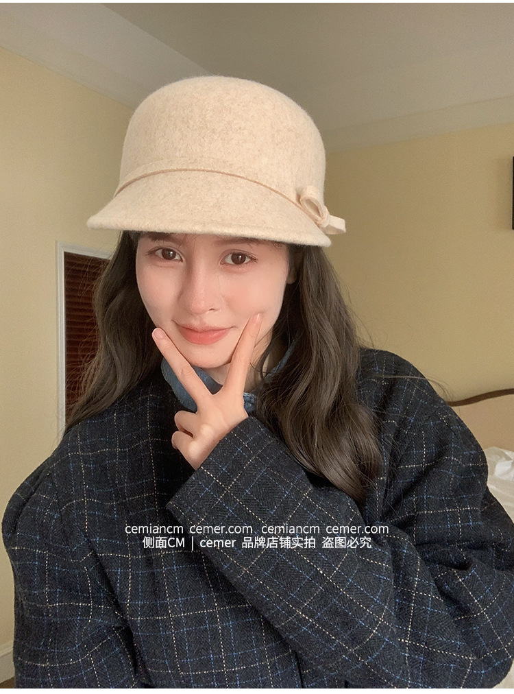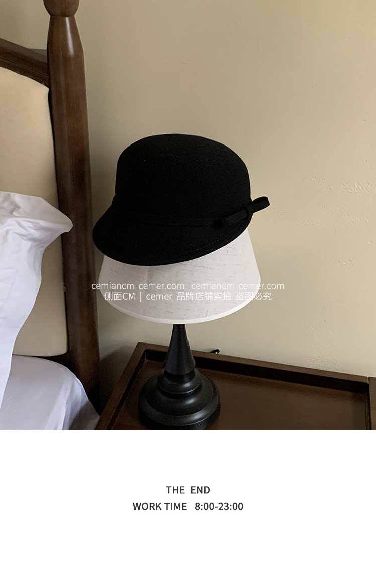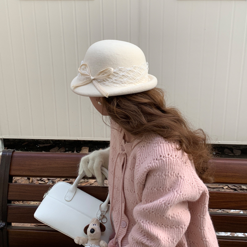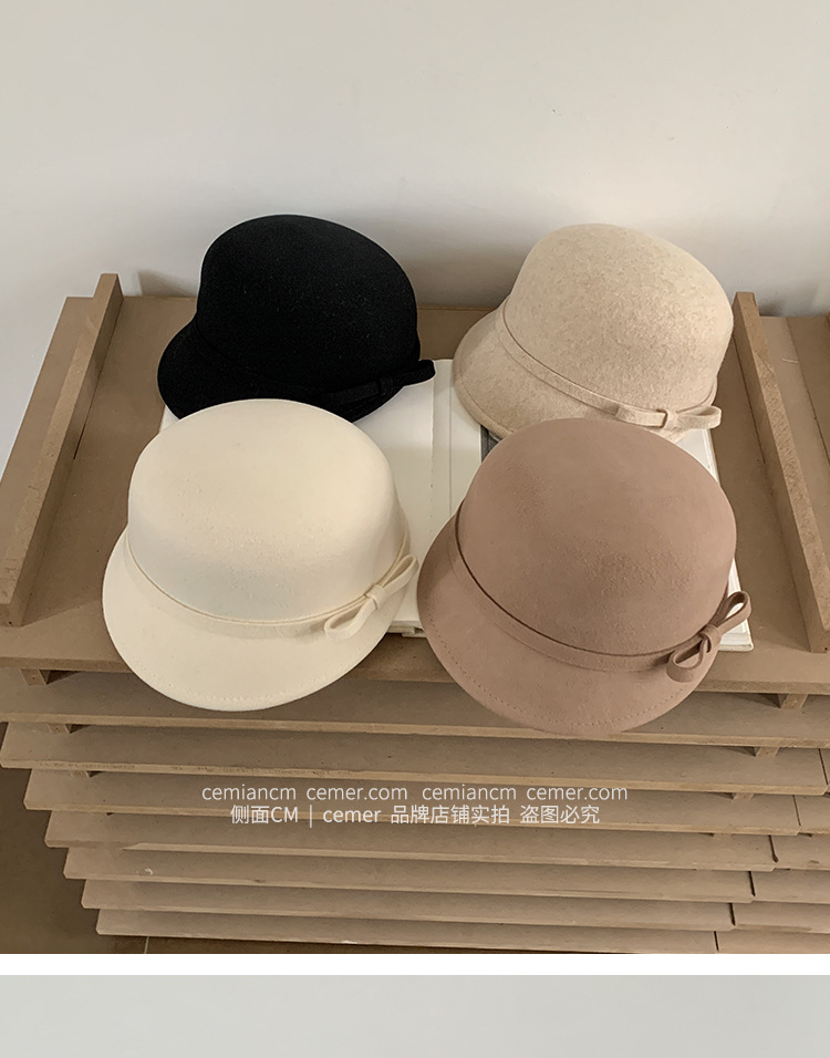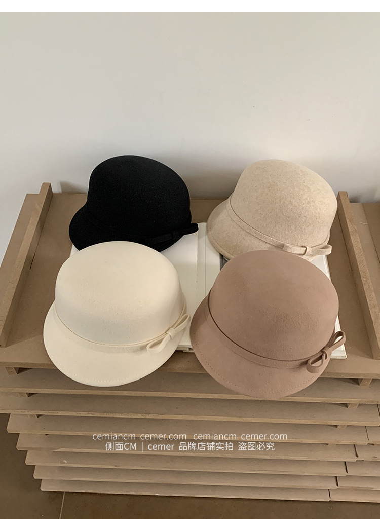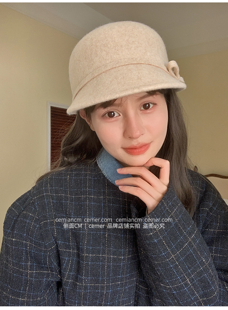 法式复古卷边羊毛礼帽女秋冬高级感细蝴蝶结渔夫帽千金风优雅盆帽