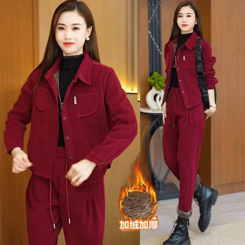 冬のベルベット保温ファッションスーツ女性の新しい母親は年齢を減らすコーデュロイのコートを着て高級な2セットを厚くした