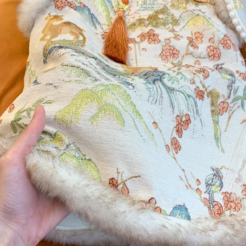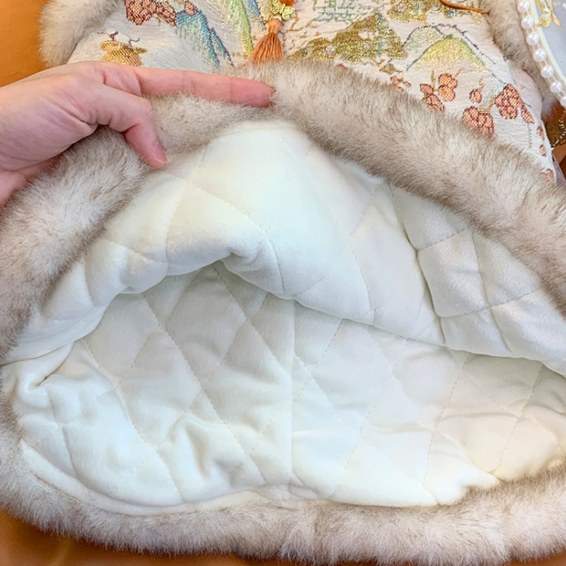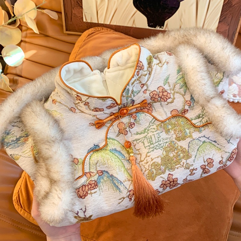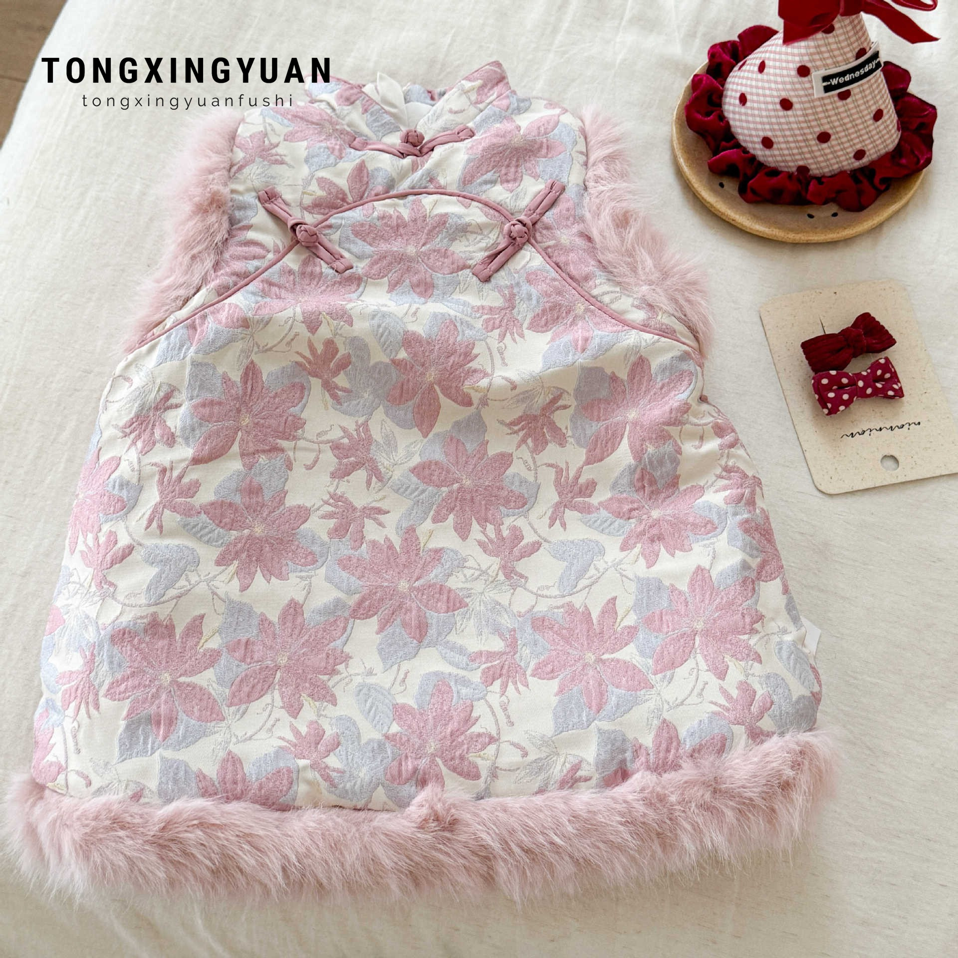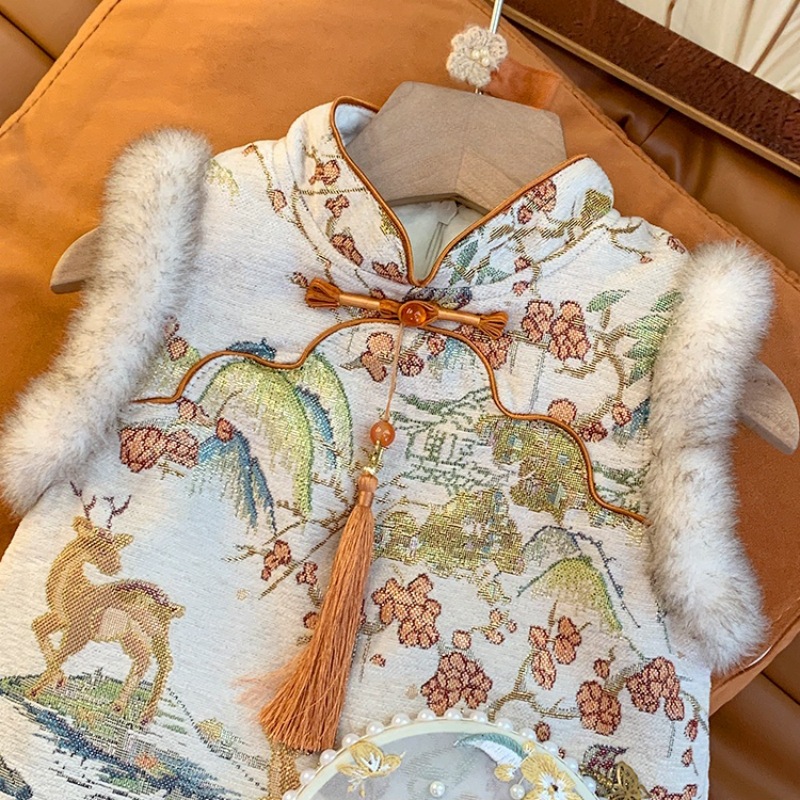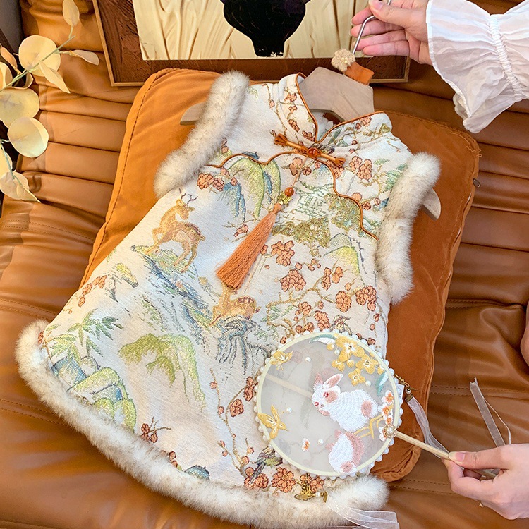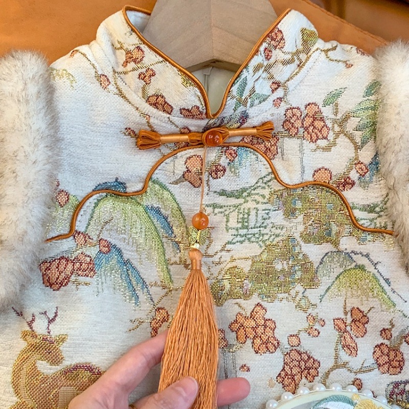 女童中国风旗袍裙时髦花边盘扣提花唐装背心裙宝宝过年加绒公主裙