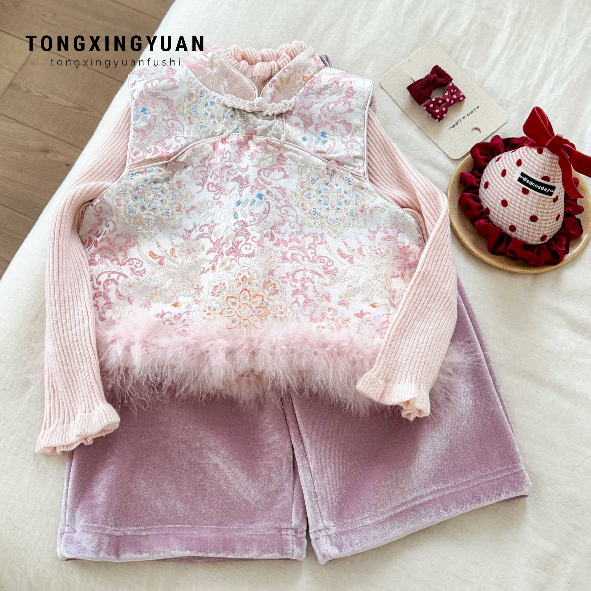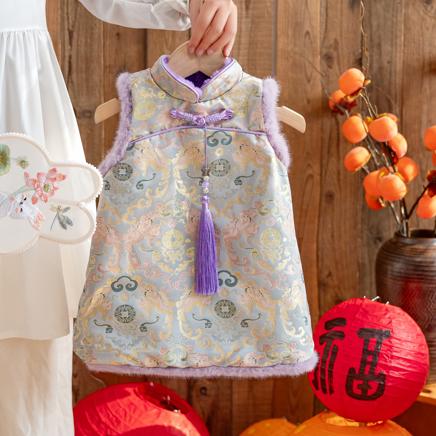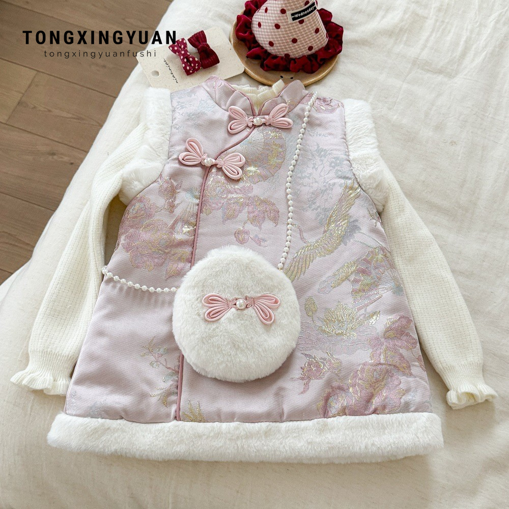 童星園女児用裏起毛ベストワンピース、チャイナドレス風ワンピース、2025年新作、中国風、1歳のお祝いドレス、女児用新年ワンピース
