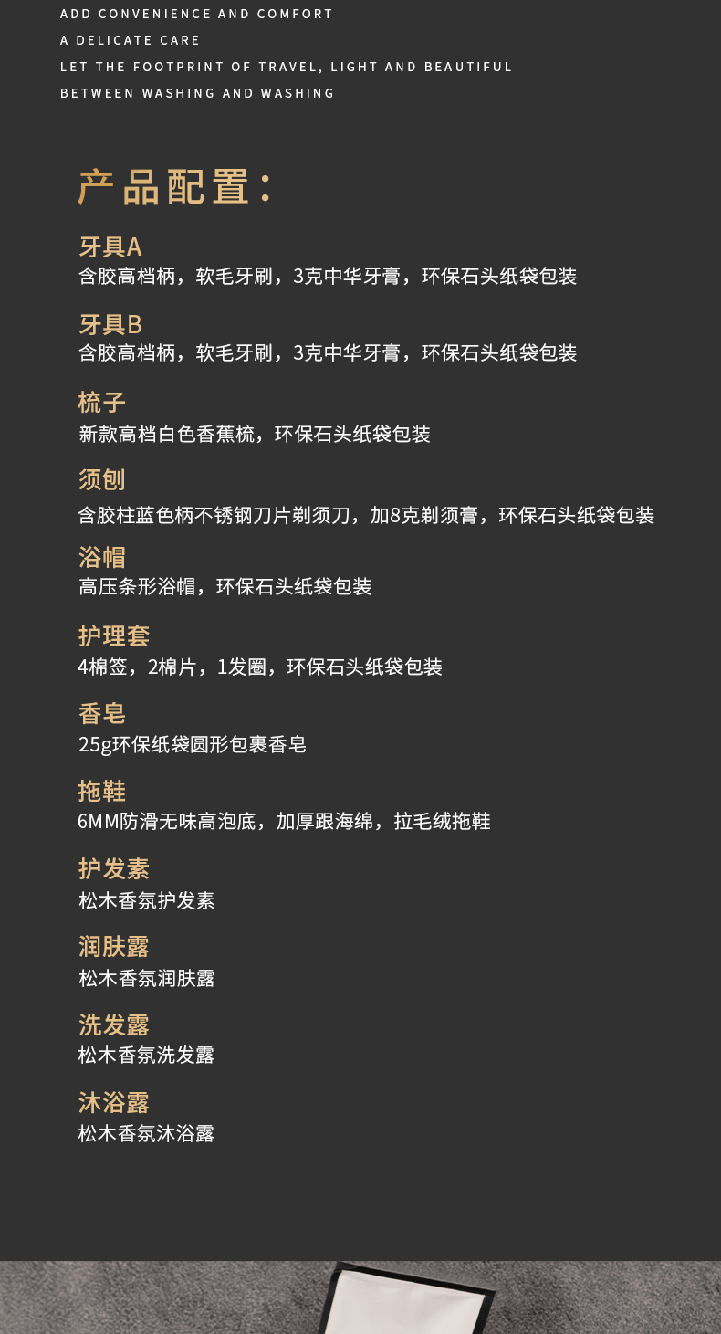 歯科用具A【10本入】,歯科用具B【10本入】,コーム【10本入】,ビーブ【10本入】,ケアパック【10個入】,シャワーキャップ【10個入】,スリッパ【10枚入】,石鹸【10個入】,シャンプー【10個入】,シャワージェル【10本入】,ヘアローション【10個入】,ボディローション【10本入】