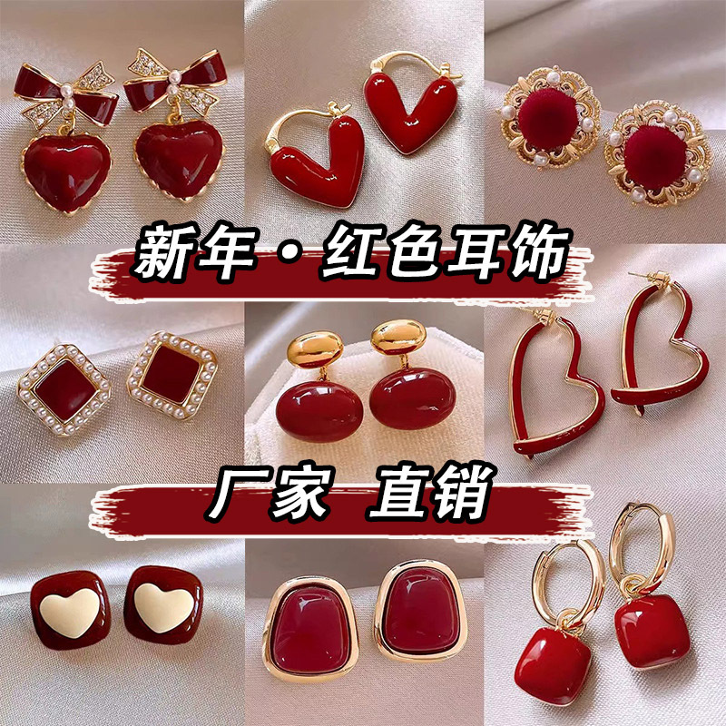 安可拉红耳钉女酒红复古港风耳夹新年滴釉植绒轻奢高级感秋冬耳饰
