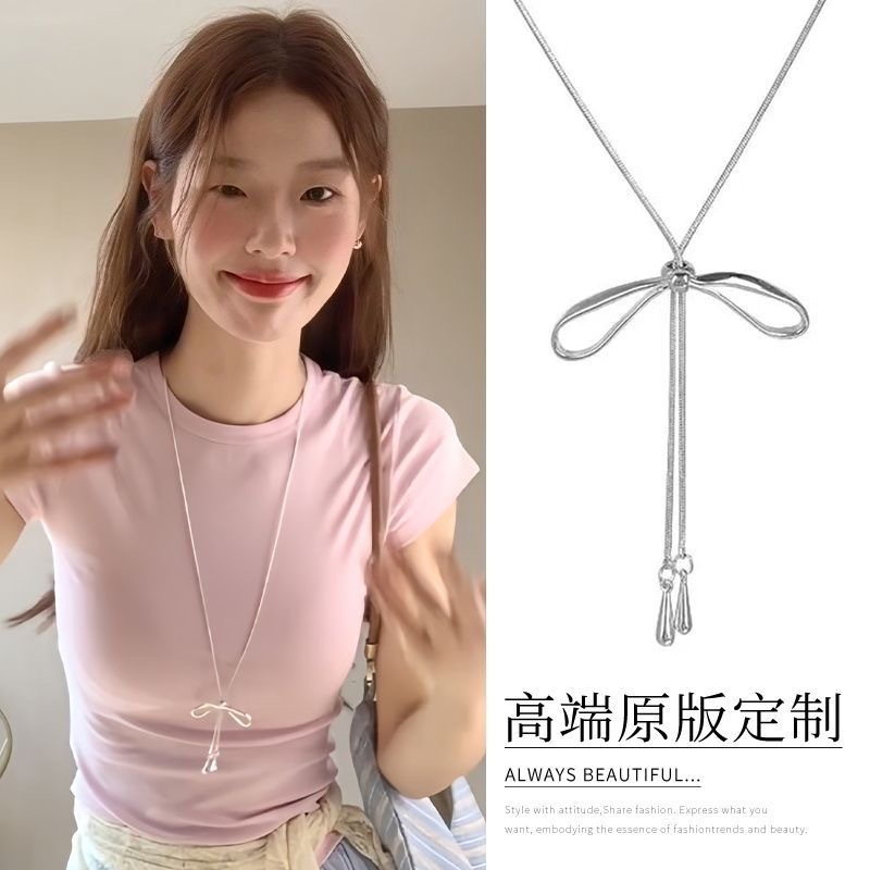 甜美简约抽拉蝴蝶结项链女韩系小众设计感长款卫衣链配饰百搭新款
