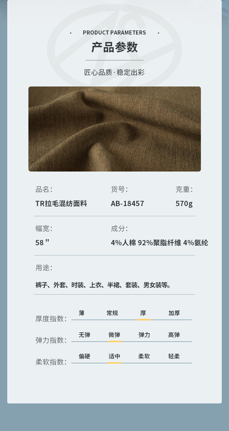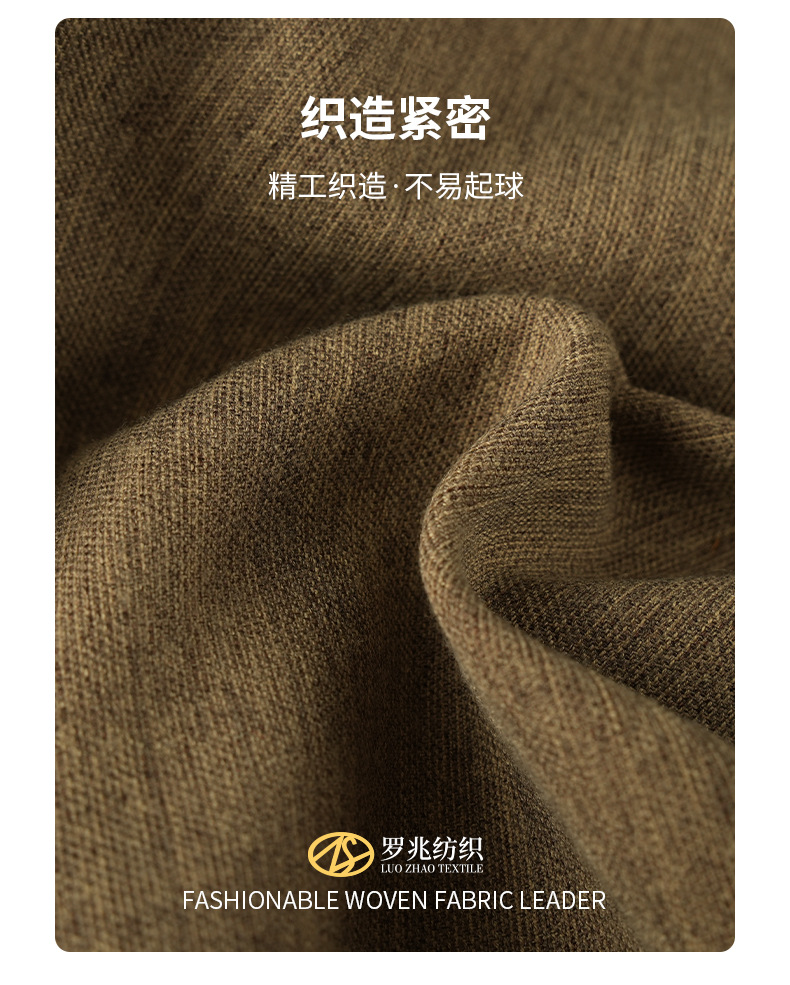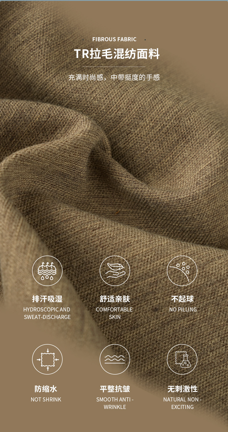 機能的特徴 TR起毛混紡生地スタイル、柔らかな肌触りとドレープ性、柔らかな肌触りとハリ感があり、生地を柔軟でスタイリッシュにしながらもファッション性に富んでいます。